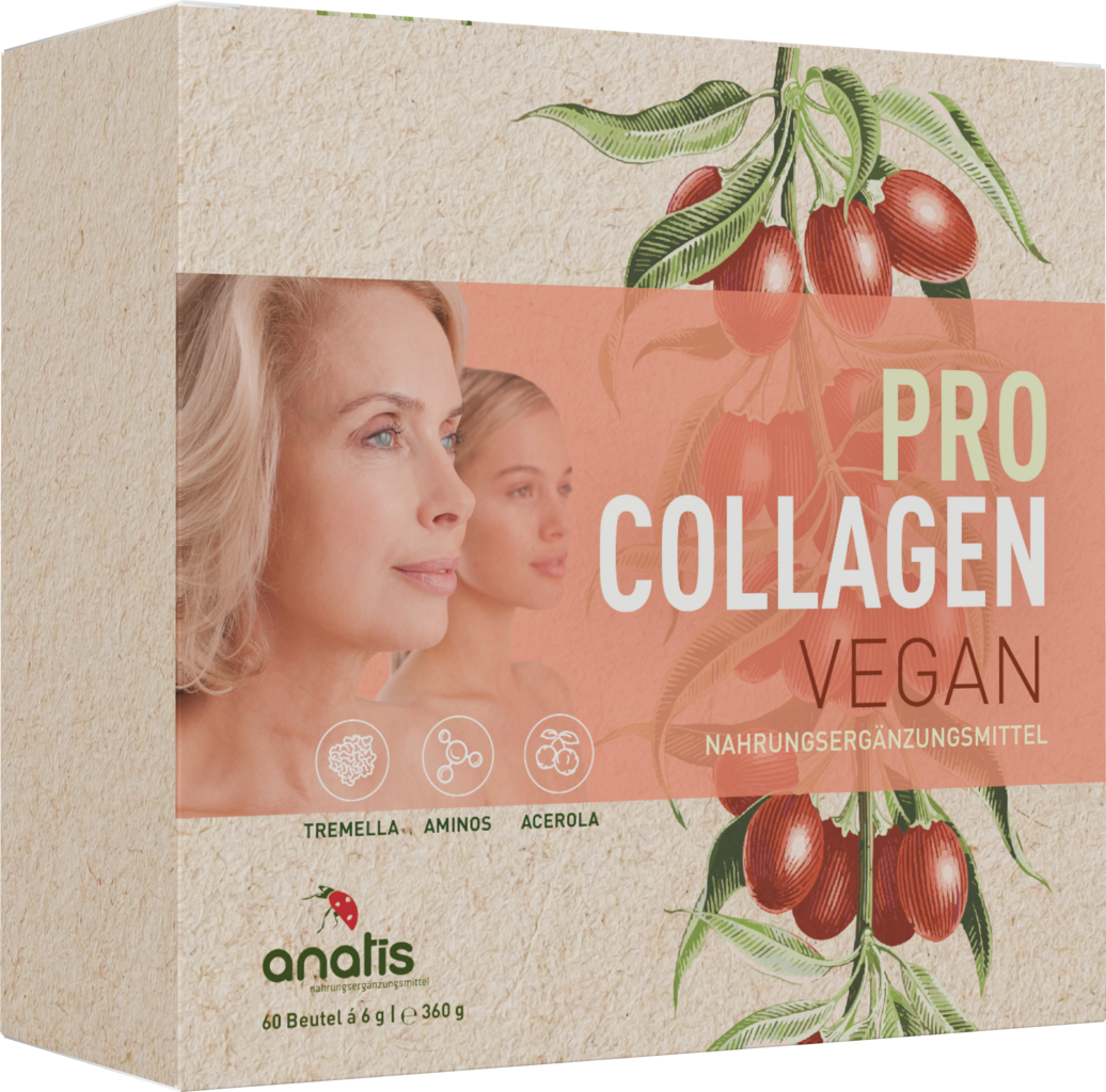 Pentru a evita utilizarea colagenului de origine animală din creșterea intensivă a bovinelor, anatis a dezvoltat Pro Collagen vegan, o formulă sofisticată din nutrienți selectați cu grijă. Aminoacizii vegani L-lizină, glicină și L-prolină sunt baza, fiind optimizați cu vitamina C naturală din Acerola și cu ciuperca Vitală Tremella. Îmbogățit cu pudră de lapte de ovăz, Pro Collagen vegan este ușor de transformat într-o băutură și își atrage utilizatorii cu un gust plăcut.