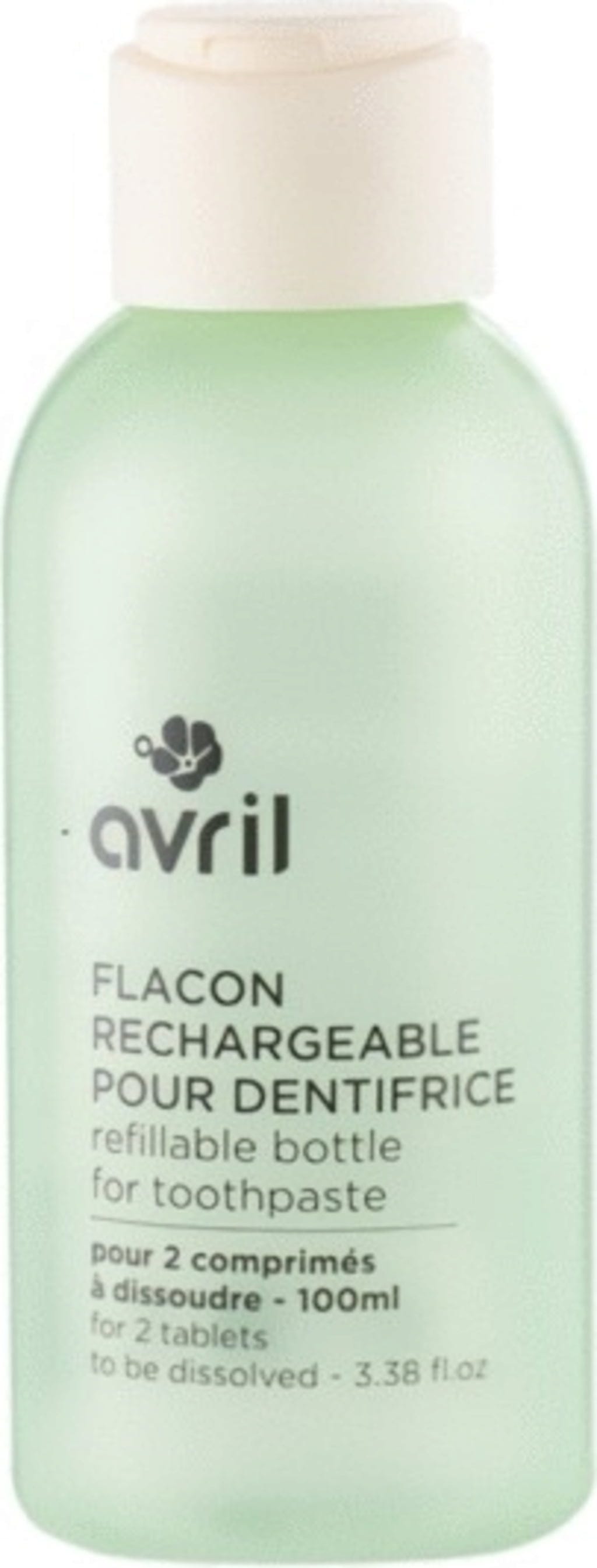 Această sticlă poate fi folosită pentru a dizolva reumplintele de pastă de dinți de la Avril, transformându-le într-un produs cosmetic gata de utilizare. Este fabricată din HDPE, poate fi reîncărcată de mai multe ori și este ușor reciclabilă la sfârșitul ciclului său de viață.