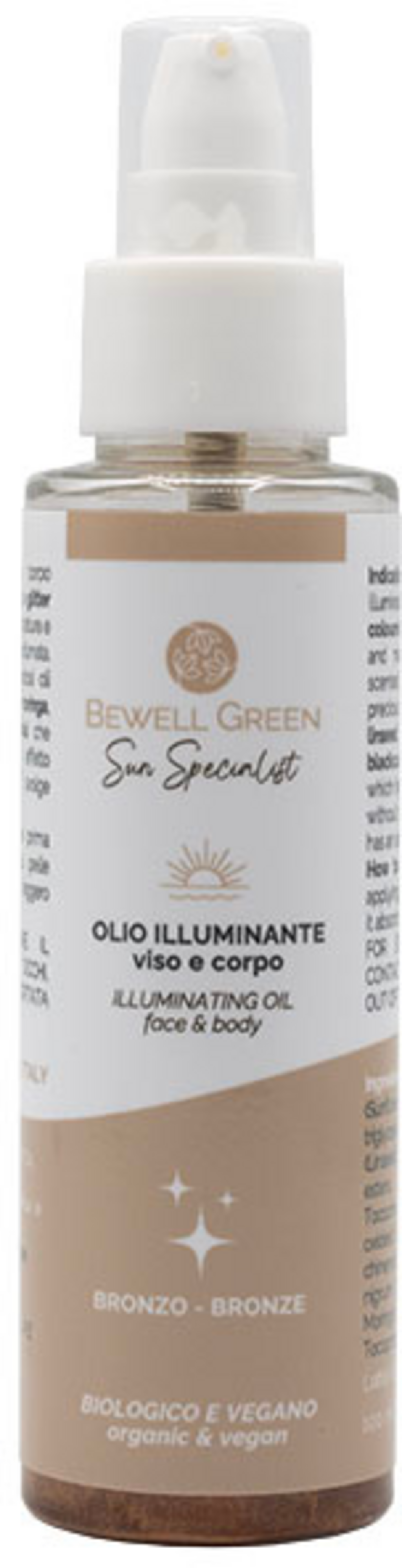 Acest ulei special pentru față și corp este îmbogățit cu particule minerale strălucitoare de culoarea bronzului, intensifică bronzul și lasă pielea netedă și parfumată. Conține un amestec de uleiuri vegetale prețioase, hidratante, care hrănesc fără a lăsa o peliculă grasă.