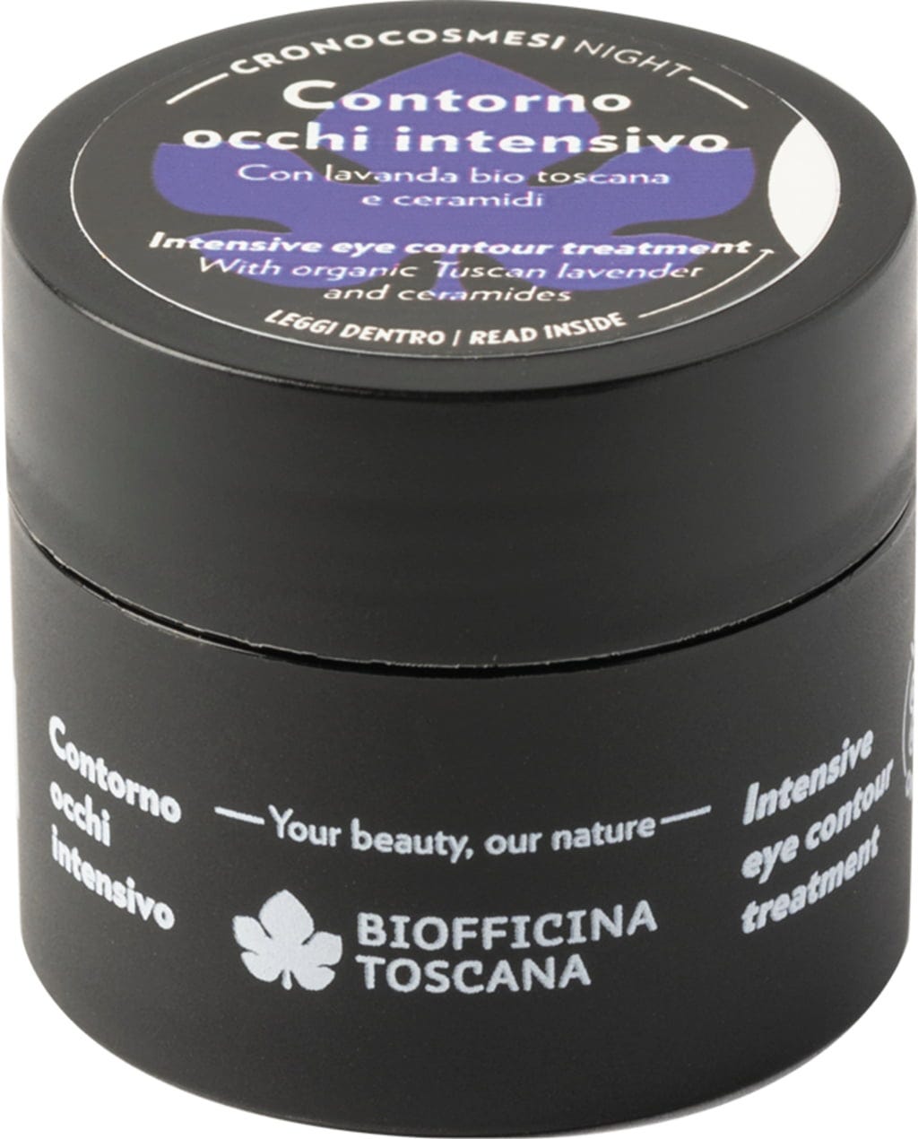 Această îngrijire intensivă a ochilor completează linia Cronocosmesi Night și oferă o îngrijire de noapte pentru toate tipurile de ten. A fost formulată cu uleiuri vegetale prețioase, lipide și ceramide care previn uscăciunea, în timp ce squalanul vegetal și aminoacizii, în sinergie cu niacinamida, asigură un aspect uniform și oferă proprietăți reparatoare. Textura sa bogată hidratează și netezește, fiind însoțită de hidrolați organici toscani de mușețel și lavandă.