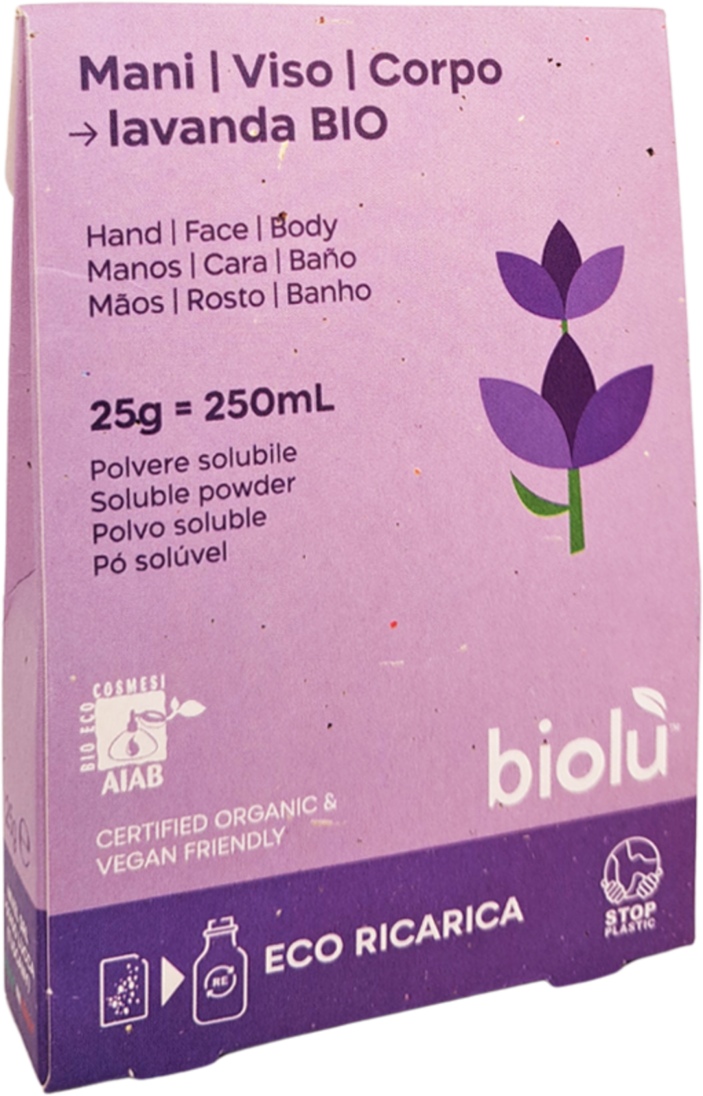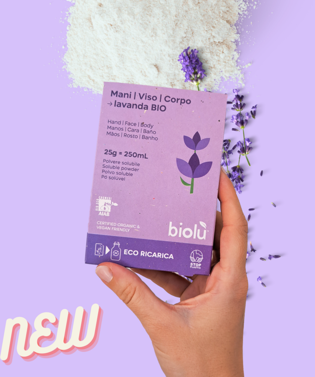 Această reumplere practică sub formă de pudră este ideală pentru a reumple dozatoarele biolù. Un plic produce 250 ml de săpun, care este deosebit de blând cu pielea și care, datorită extractelor organice de lavandă, asigură o piele plăcută și parfumată.
