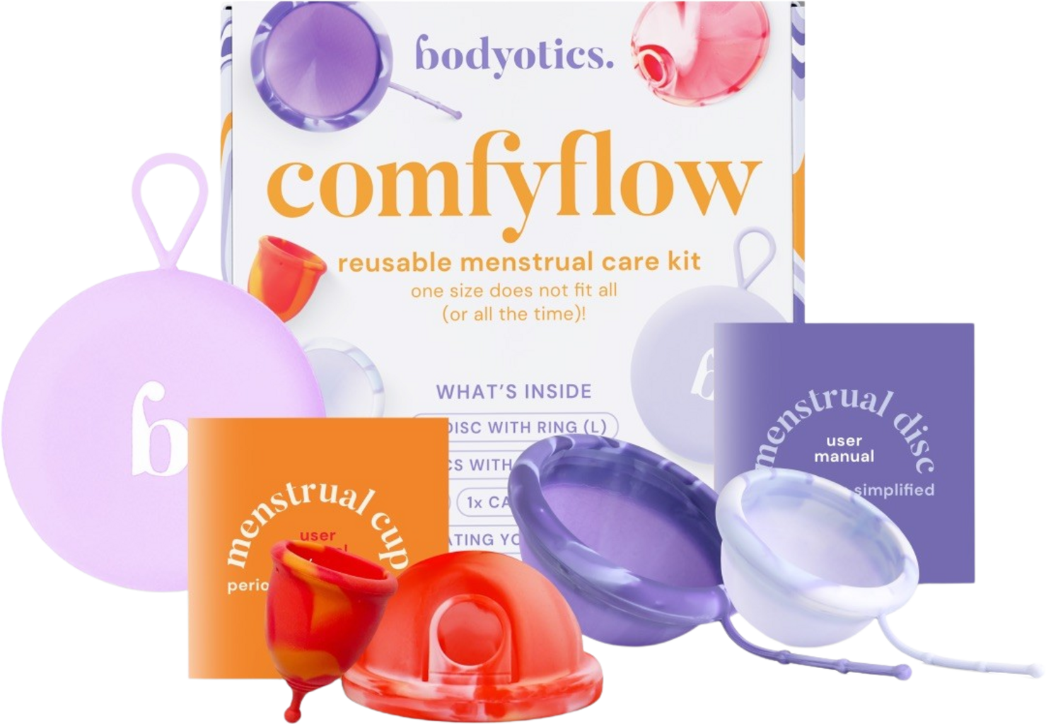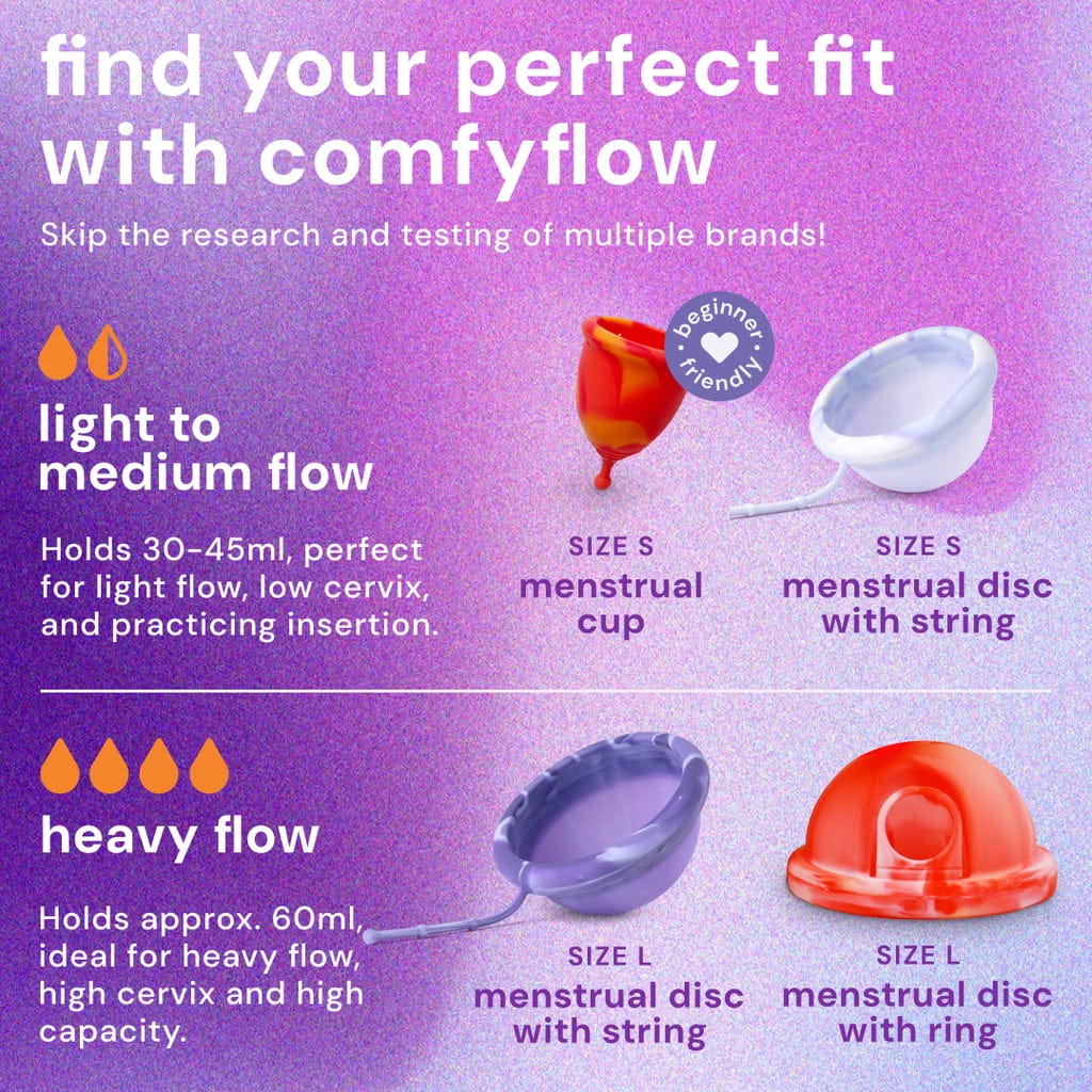Dacă nu ai experiență cu utilizarea discurilor menstruale, setul Comfyflow de la bodyotics poate fi perfect pentru tine. Deoarece utilizarea discurilor menstruale poate fi la început mai dificilă, setul include o cupă menstruală mică, pentru a-ți permite să exersezi înainte de a trece la discuri.