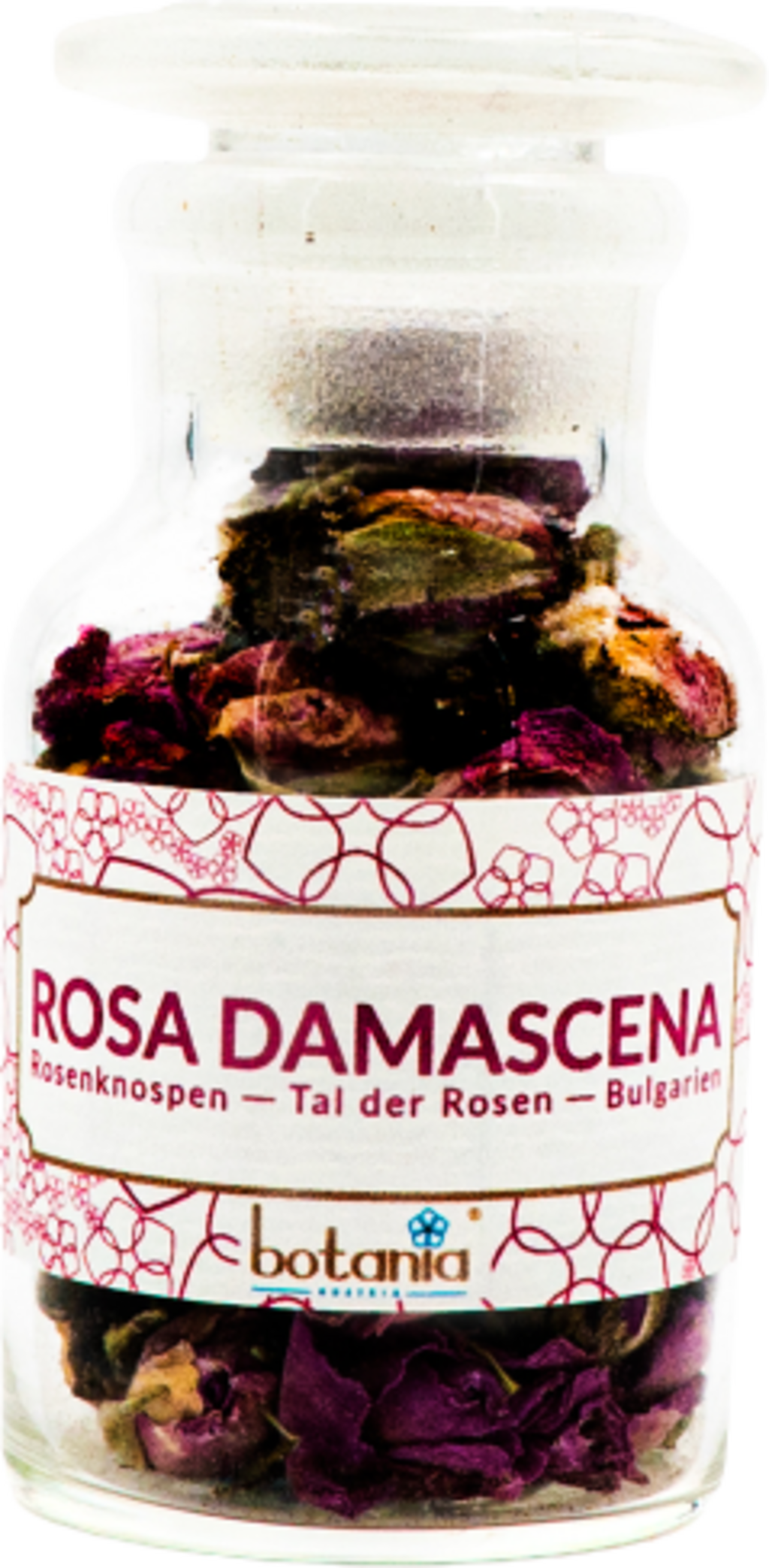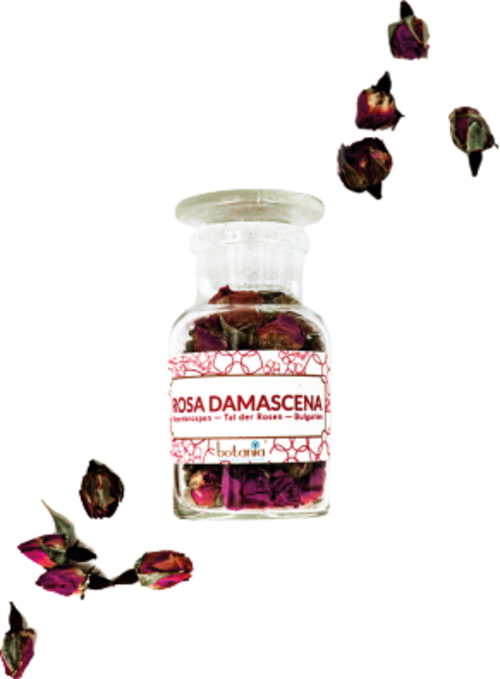 Aceste boboci fragili de trandafir Damascena emană un parfum unic, aromatic și sunt un adaos special pentru fumat. Trandafirii provin din Valea Trandafirilor din centrul Bulgariei, unde sunt recoltați în condiții echitabile. Trandafirii au o culoare de la roz pal până la roz închis, sunt netratați și nu conțin arome suplimentare. Sticluța din sticlă reciclată de farmacie păstrează în mod optim mirosul bobocilor.