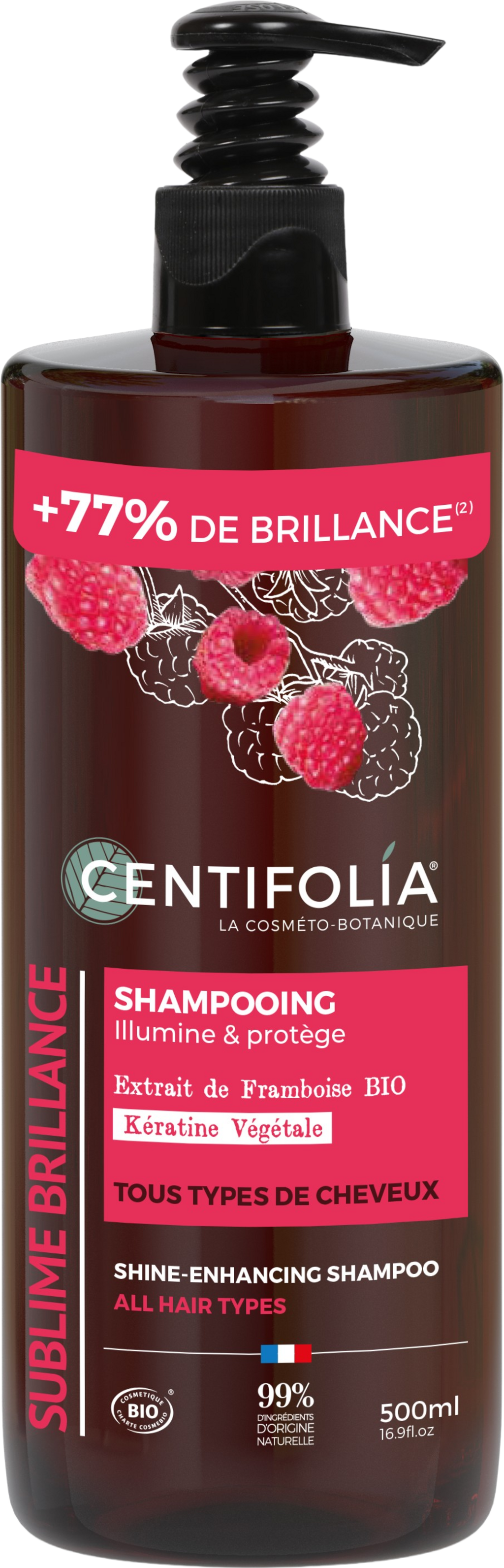 Șamponul de strălucire, potrivit pentru toate tipurile de păr, curăță părul blând și atent, datorită formulei sale ultra-delicate și fără sulfați. Ingredientele active selectate, precum extractul de zmeură organică și keratina vegetală, oferă proprietăți protectoare, strălucire și lejeritate. În plus, părul devine mai ușor de pieptănat.