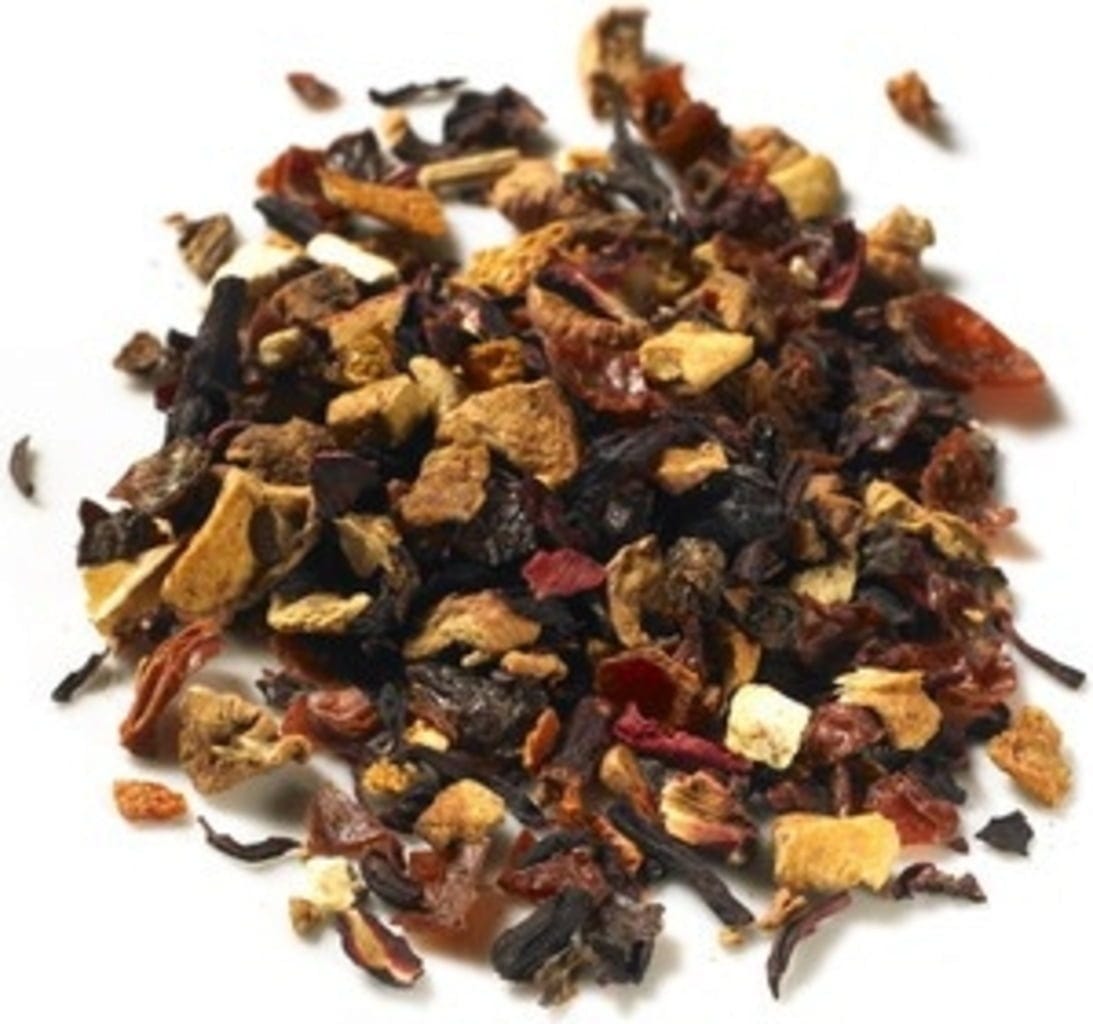 Hagebuttenschalen, Apfelscheiben, Hibiskusblüten, Orangenschalen, Aroma, Himbeerstücke