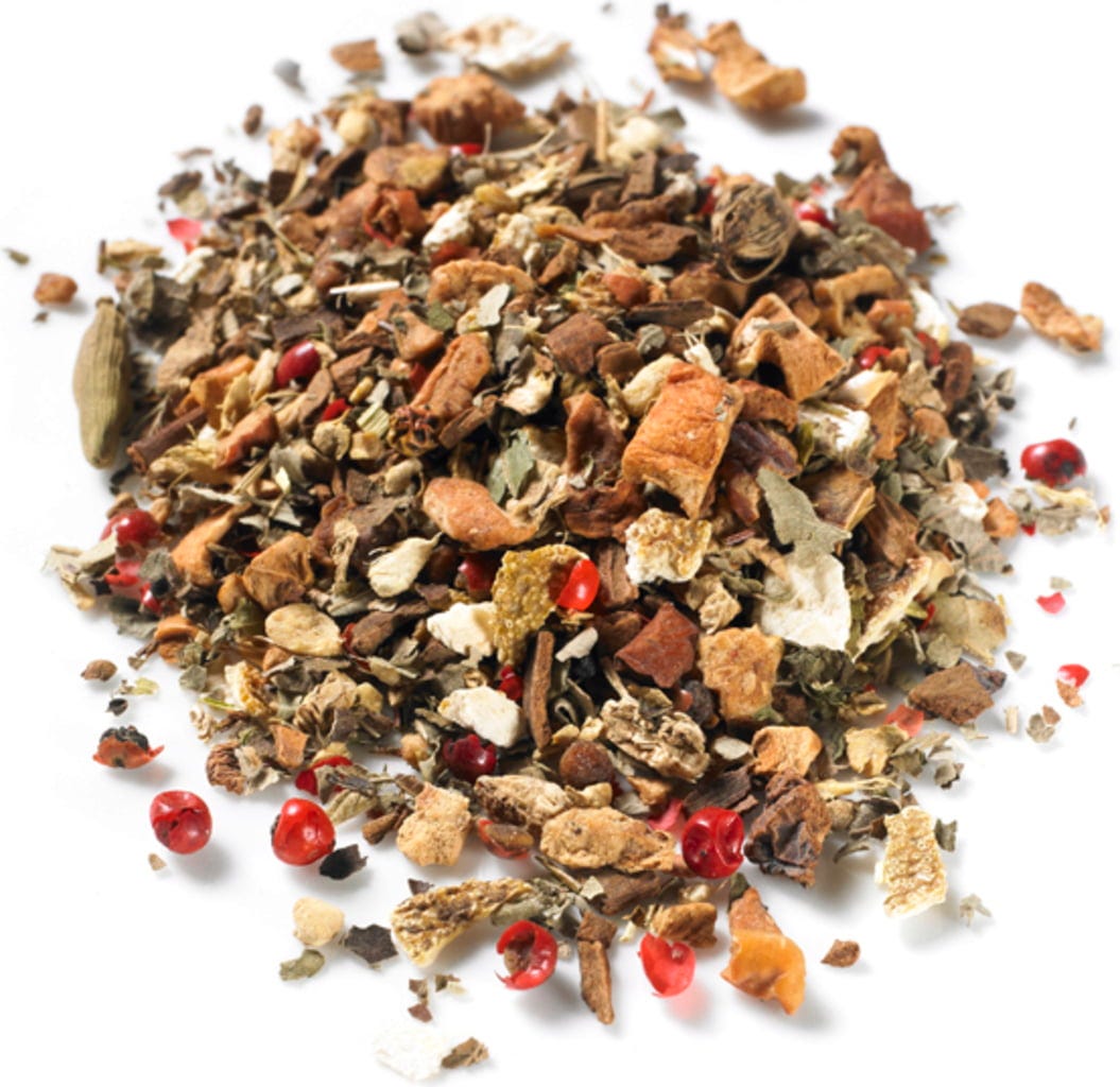 Bucăți de mere, coji de citrice, scorțișoară, bucăți de ghimbir, cardamom, piper roz, frunze de mur, ceai Rooibos și busuioc formează un amestec de ceai delicat-picant, extrem de gustos și revigorant, care este minunat de savurat și rece.