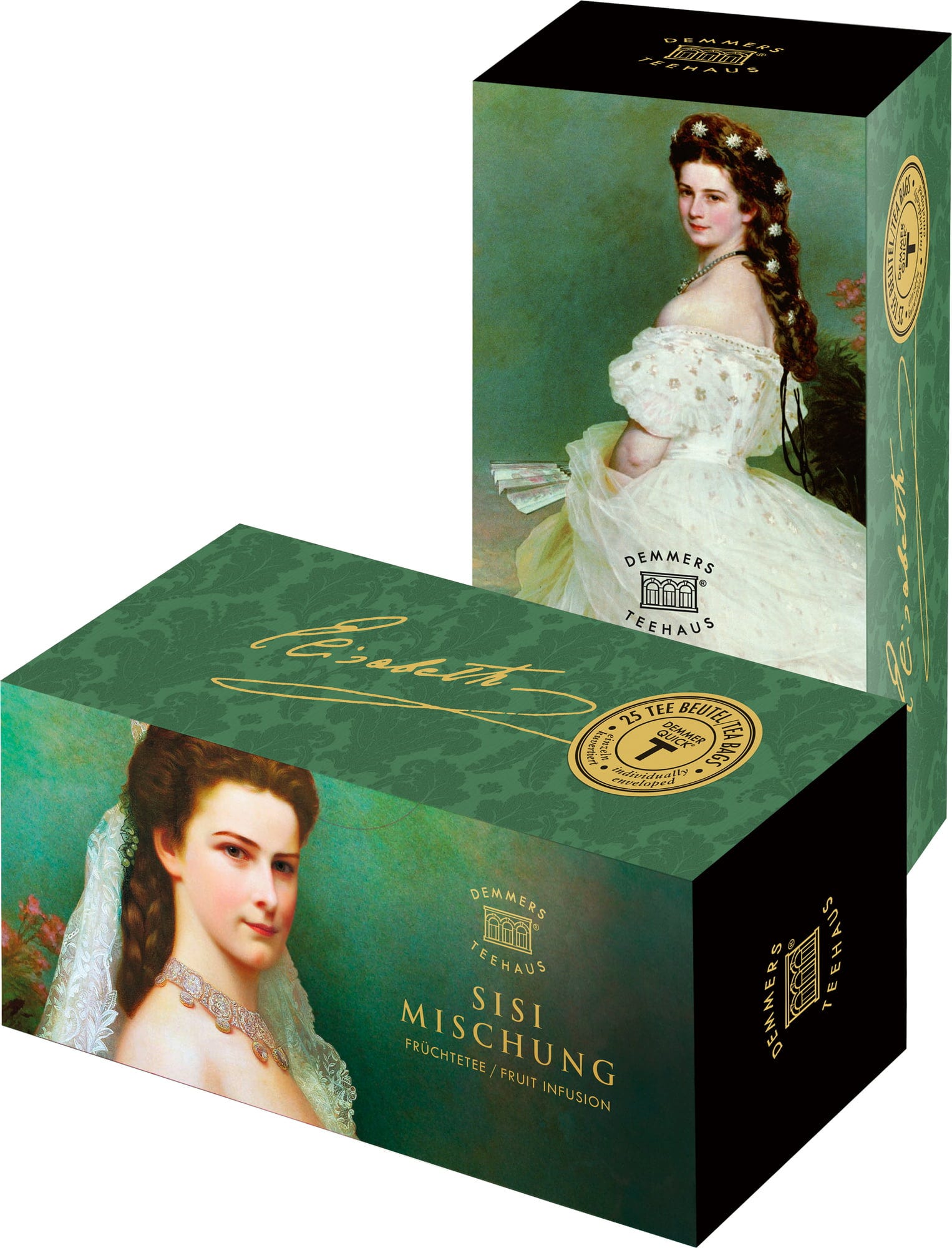 Compoziția plină de savoare din măceșe, hibiscus, măr și portocală, însoțită de flori de albăstrea, oferă o plăcere de ceai atemporală și armonioasă. Portretul celebrei Sissi, realizat de Franz Xaver Winterhalter, face ambalajul să fie cu adevărat special.