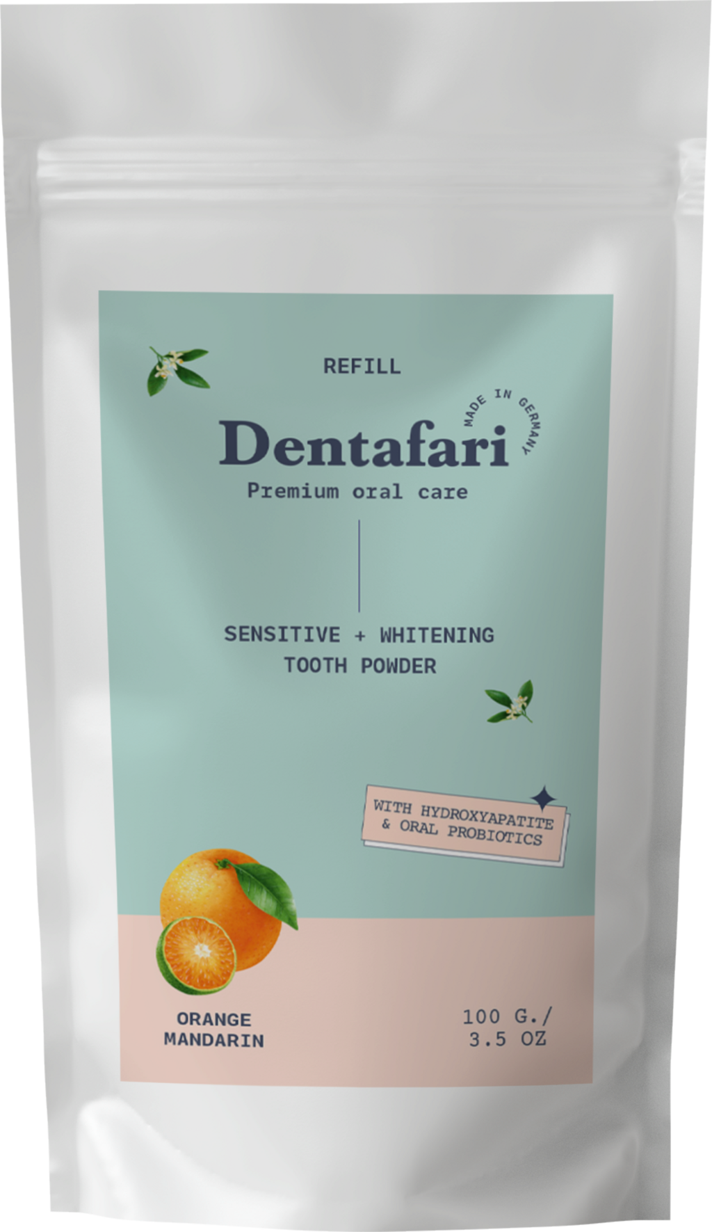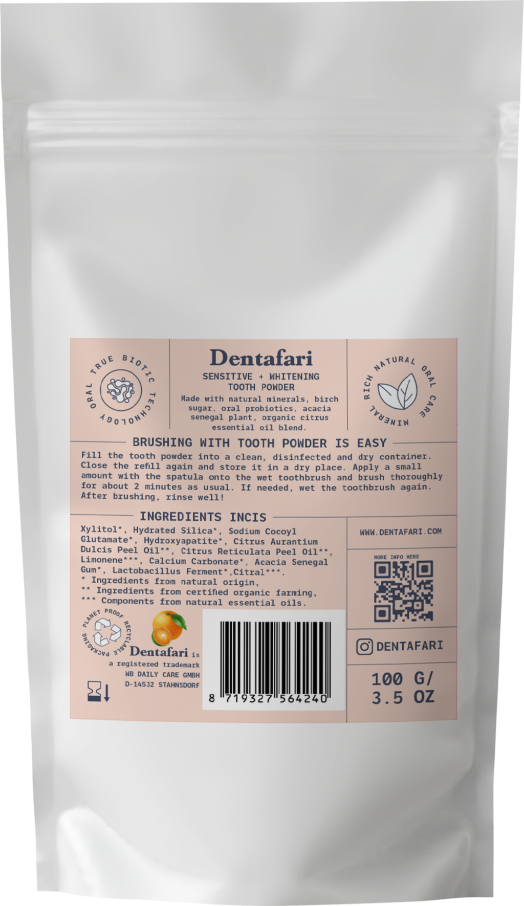 Pudra de dinți de la Dentafari curăță dinții și gingiile în mod delicat, dar temeinic, datorită ingredientelor valoroase și eficiente. Gustul fructat de portocale și mandarine transformă fiecare periaj într-o experiență plăcută. Acest produs inovator este vegan și ambalat fără plastic.