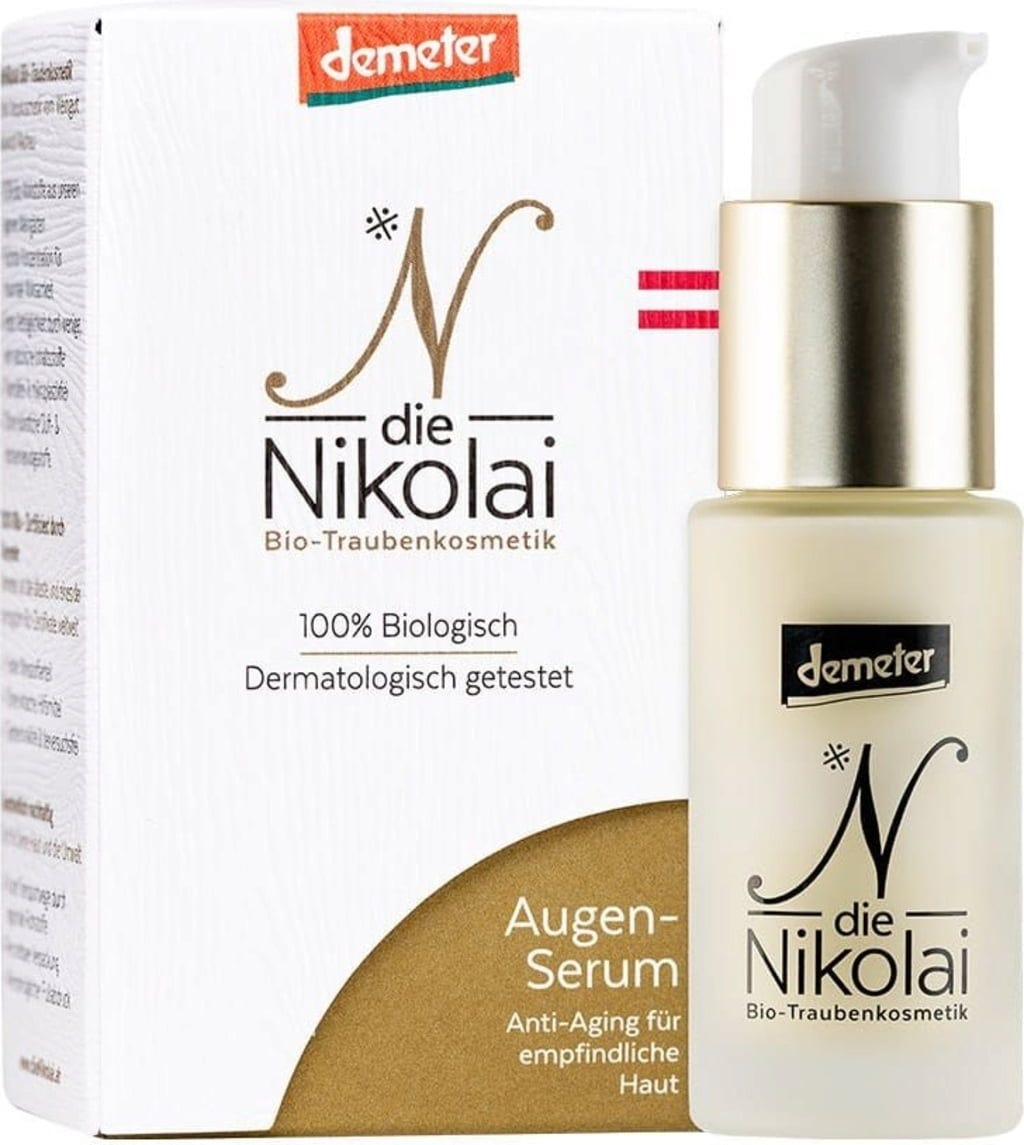 Zona delicată a ochilor este expusă zilnic la mișcările feței și stresul, necesitând astfel o îngrijire specială. Serul pentru ochi certificat demeter, datorită texturii sale lichide, este rapid absorbit și foarte eficient. Pentru a proteja pielea de agresiunile mediului, uleiul de camelină și uleiul de semințe de struguri furnizează antioxidanți, în timp ce Resveratrolul combinat cu extractul de hamamelis oferă pielii suficientă hidratare și fermitate.