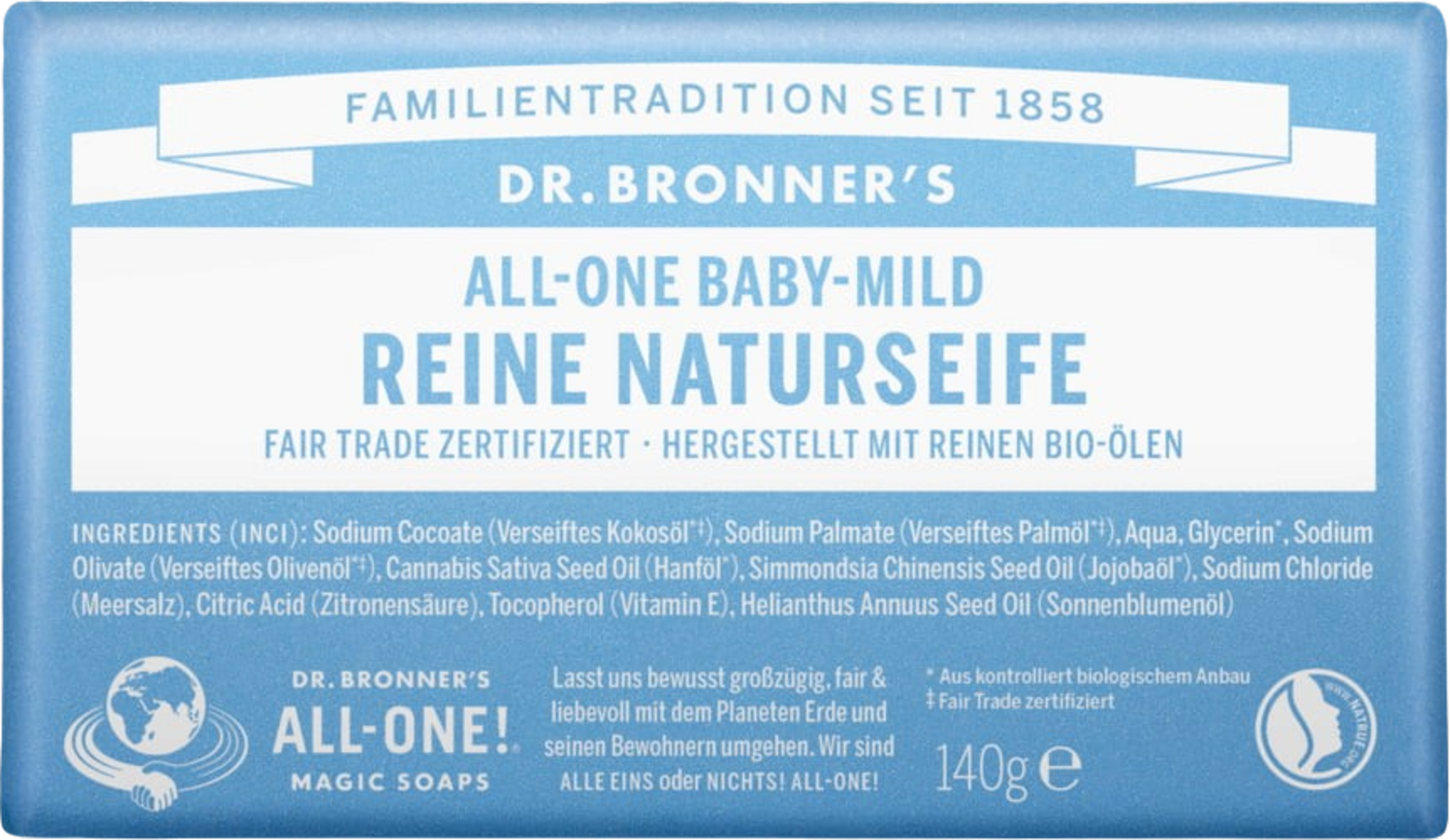 Acest sapun unic de Dr. Bronner BB´s este unul dintr-o combinaţie de biologic active de nucă de cocos, masline, jojoba si Hanfölen şi uleiuri esentiale pure. Se curăţă eficient fără a fi agresiv şi produce o spumă catifelat, care face ca pielea moale ca mătasea şi reîmprospătează. Toate săpunuri sunt certificate de Oregon Tilth. În conformitate cu normele de comerţ echitabil este inspectate periodic de către societatea de certificare elveţian respectat OMI.