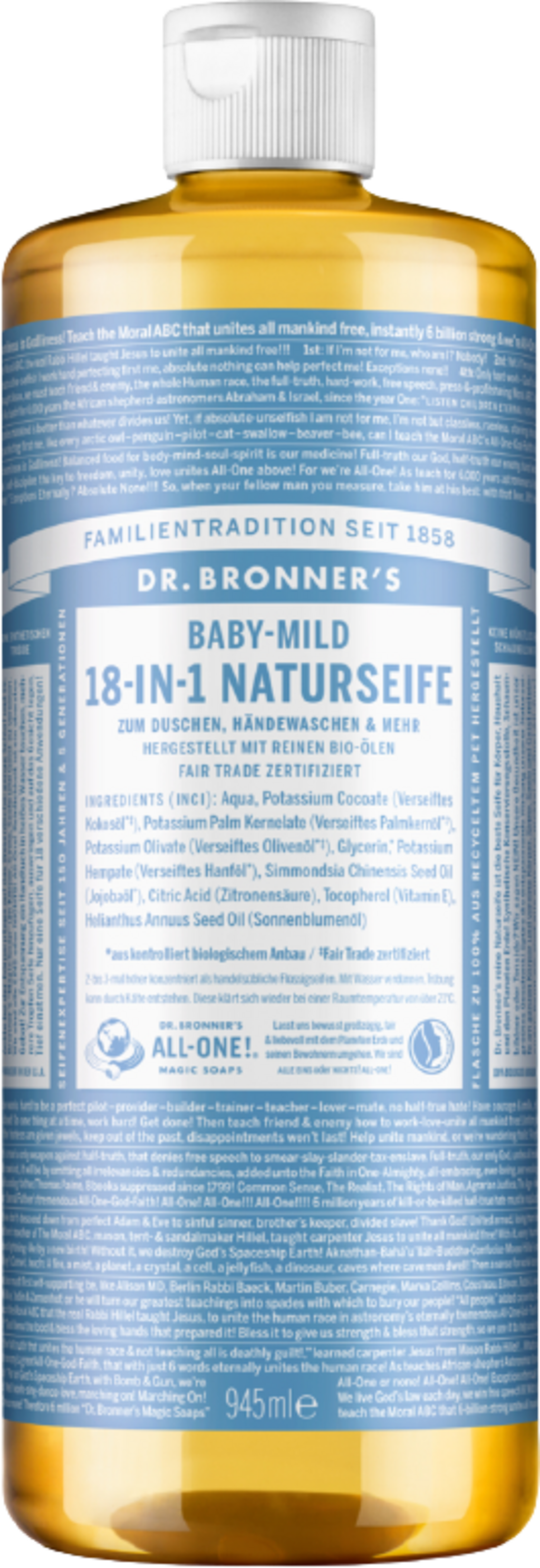 Săpunurile lichide de la Dr. Bronner sunt o combinație din nucă de cocos organic, măsline, jojoba și cânepă,uleiuri active și uleiuri esențiale pure.Curăță eficient, fără a fi agresive și produce o spuma catifelata care lasa pielea catifelata si matasoasa cu un efect revigorant. Toate săpunurile sunt certificate de către Oregon Tilth. Respectarea normelor de comerț echitabil este monitorizată în mod regulat de certificarea independenta Elveția OMI.