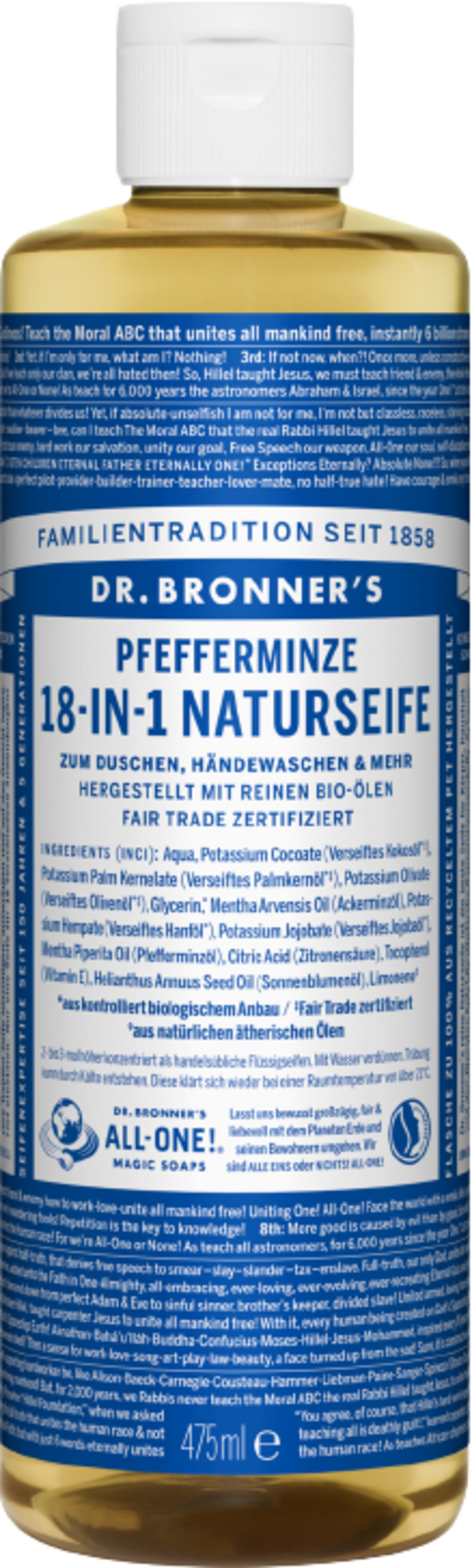 Săpunurile lichide de la Dr. Bronner sunt o combinație din nucă de cocos organic, măsline, jojoba și cânepă,uleiuri active și uleiuri esențiale pure.Curăță eficient, fără a fi agresive și produce o spuma catifelata care lasa pielea catifelata si matasoasa cu un efect revigorant. Toate săpunurile sunt certificate de către Oregon Tilth. Respectarea normelor de comerț echitabil este monitorizată în mod regulat de certificarea independenta Elveția OMI.