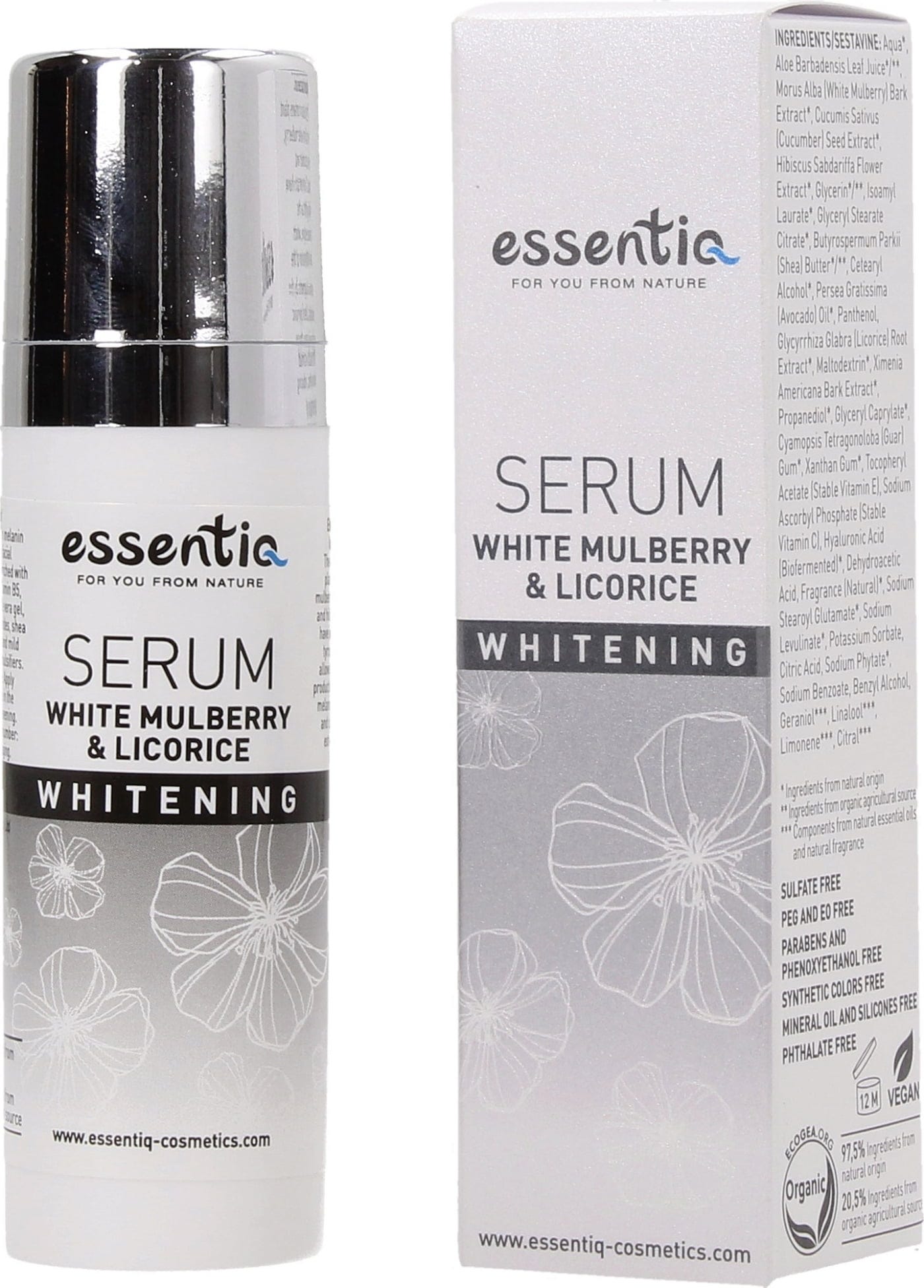 Acest Whitening Serum a fost formulat special pentru pielea cu pete pigmentare. Combinația de diferite extracte de plante, precum dudul alb, lemnul dulce, castravetele și hibiscusul, inhibă enzima tirozinază, ceea ce poate reduce producția de pete pigmentare. În plus, serul oferă o hidratare intensă și, datorită acidului hialuronic, asigură un ten neted și radiant.