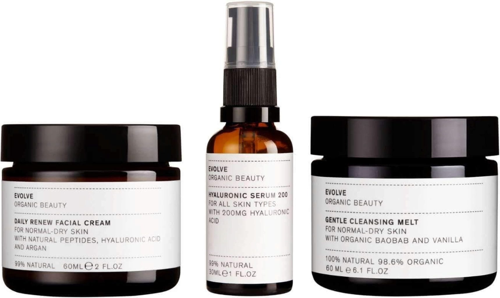 Acest set conține trei produse excelente de curățare și îngrijire pentru tipurile de piele normală până la uscată. Începând cu Demachiantul Gentle Melt, care promite o curățare profundă, dar extrem de delicată, continuând cu Serul de Intens Hidratare cu Acid Hialuronic, și terminând cu răsfățul adus de Crema de Față Daily Renew, aveți la dispoziție cele trei produse cosmetice esențiale pentru fiecare zi - pentru o piele frumoasă în mod natural!
