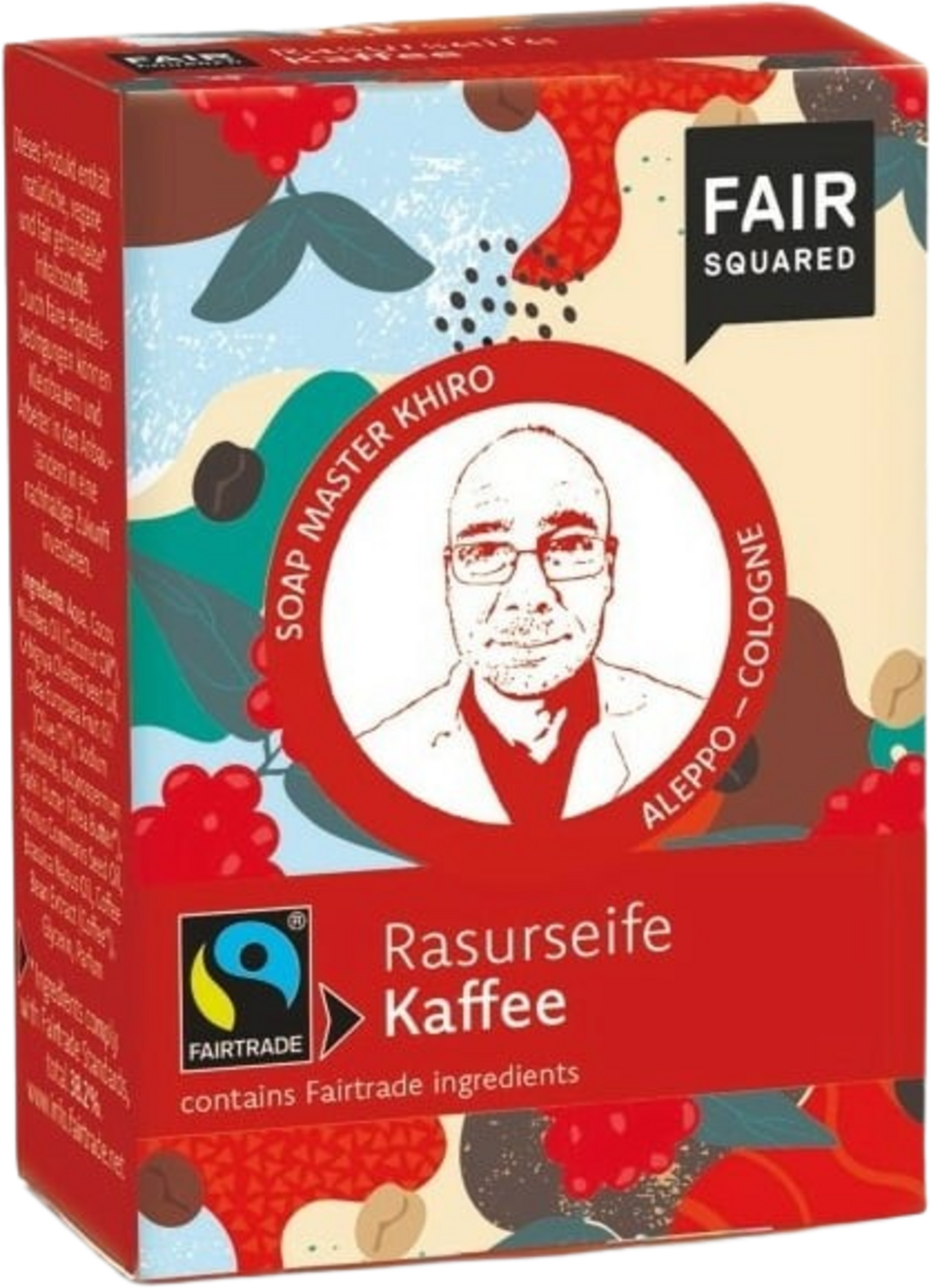 FAIR SQUARED utilizează exclusiv ingrediente comerciale echitabile pentru săpunul de bărbierit, care sunt procesate manual. Cafeaua, ceaiul, untul de shea și uleiul de cocos formează baza, asigurând un bărbierit catifelat. Ambalajul fără plastic, cu un design extraordinar, este perfect ca un cadou. În spatele codului QR se află un film despre originea și producția produsului.