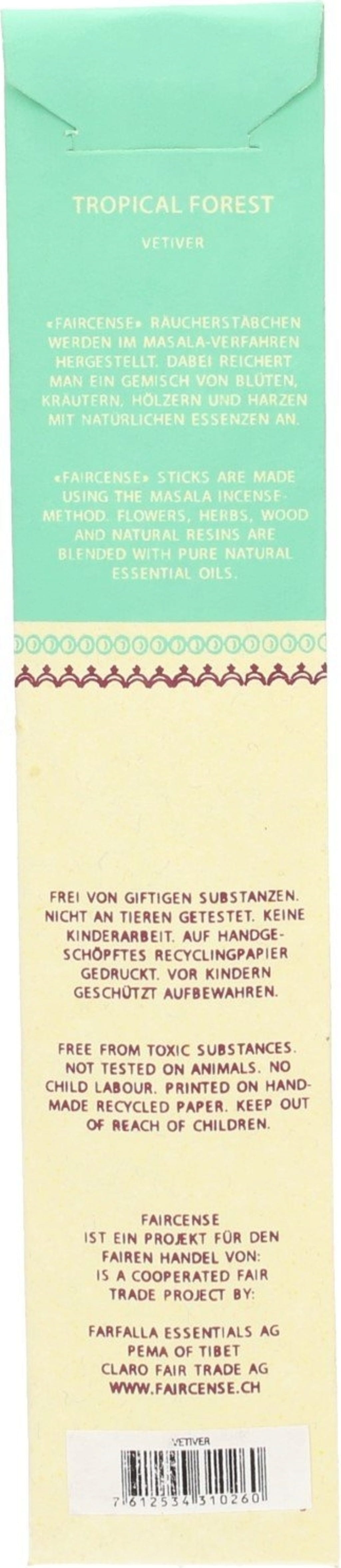 Toate bețișoarele parfumate Faircense Fairtrade sunt lipsite de arome artificiale, compuși de mosc, materiale de ardere nocive etc. Hârtia utilizată este făcută manual în India, la fața locului.