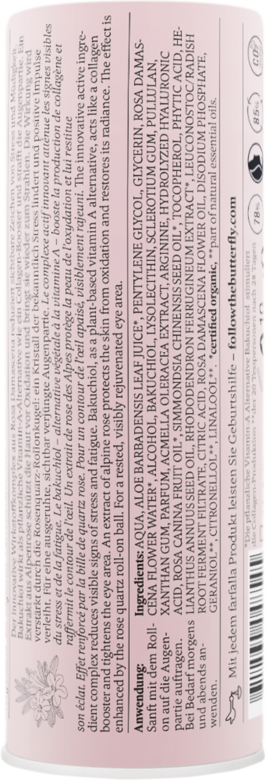 Roll-on-ul cu o bilă din cuarț roz, o piatră considerată a fi un aducător de energie pozitivă, poate fi aplicat foarte ușor și oriunde. După ce ai terminat fluidul pentru ochi, bila de cuarț poate fi extrasă din ambalaj și poate servi ca piatră de energie.