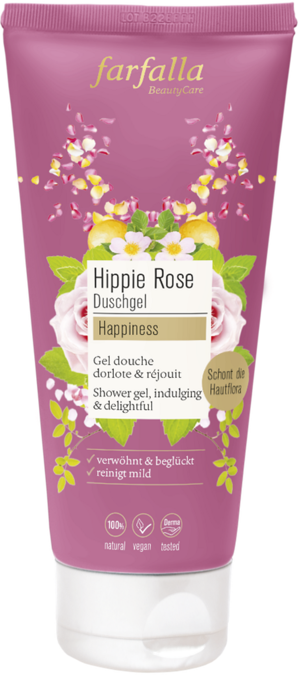 Această spumă de duș delicată nu se remarcă doar prin formula sa blândă pentru piele, ci și prin compoziția sa unică de parfumuri de trandafir, iris, vanilie și portocală. Aroma sa îți oferă momente adevărate de fericire la duș.