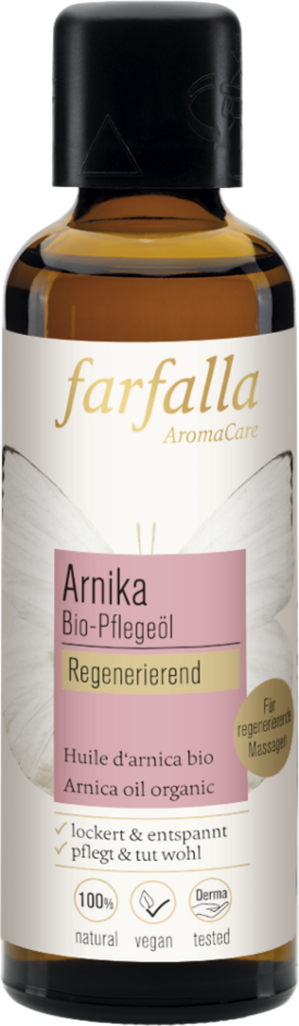 Ingredientele valoroase ale plantei de arnică sunt cunoscute pentru multiplele lor beneficii de mult timp. Uleiul de la farfalla este ideal pentru un masaj regenerant după sport și conferă pielii suplețe. Formula susține bariera de protecție a pielii și se absoarbe rapid.