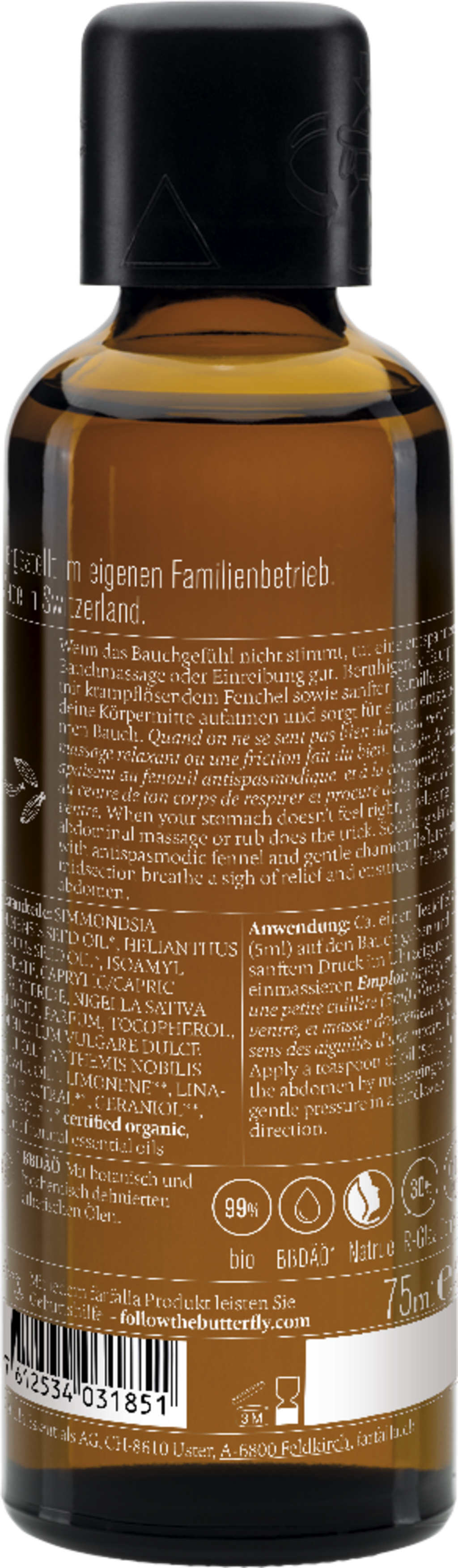 Acest ulei de masaj pentru „îngrijirea abdomenului” din linia „Echilibru pentru abdomen” de la farfalla te susține exact atunci când senzorii din partea de mijloc a corpului nu sunt în armonie. Combinația de uleiuri echilibrante din jojoba, mușețel bio și fenicul îți permite să respiri liniștit din nou, chiar și atunci când ceva îți creează disconfort gastric. Parfumul aromatic ierbos îndreaptă simțurile spre o direcție pozitivă.