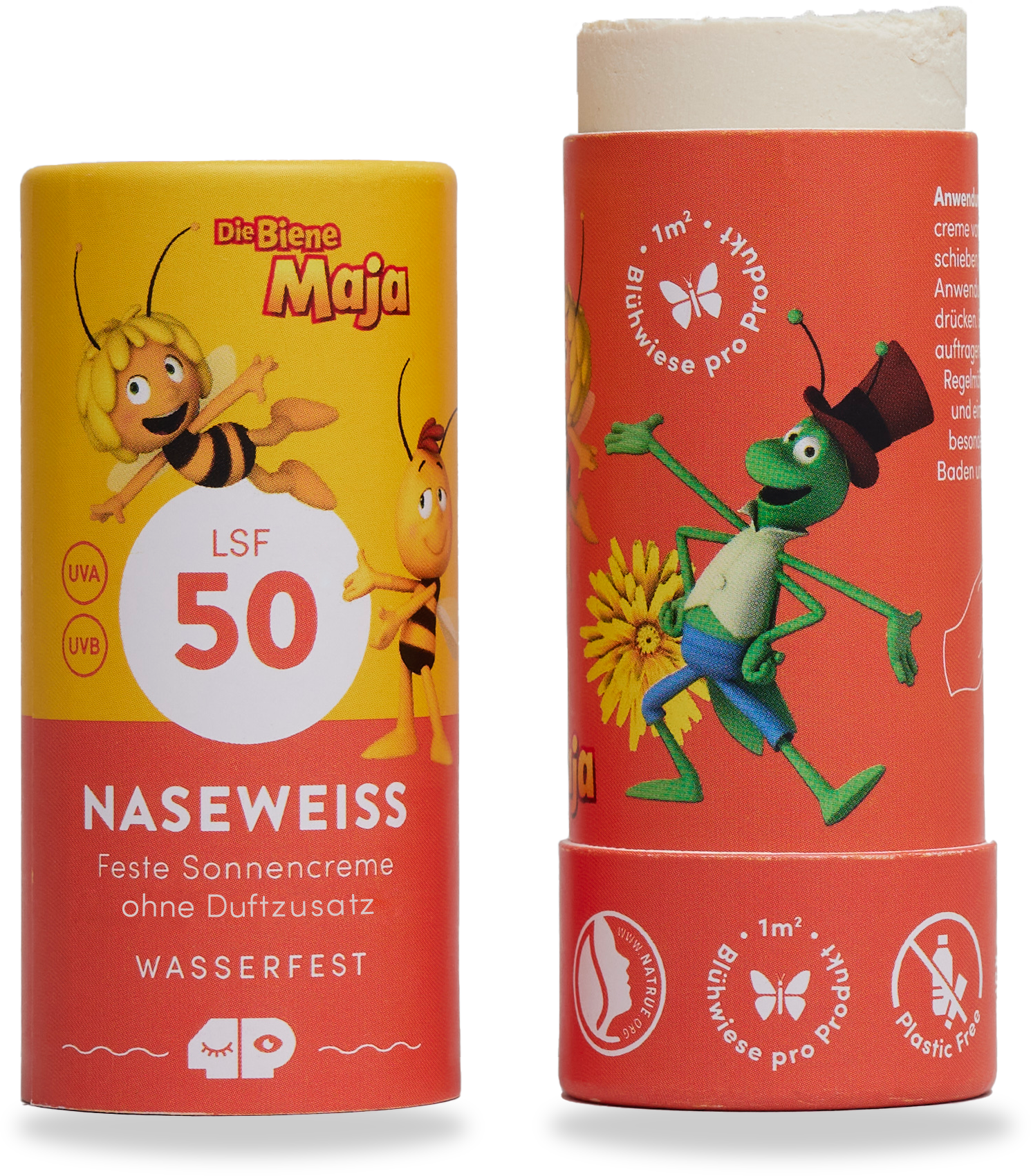 Această cremă solară compactă, inspirată de designul Biene Maja, este creată special pentru copii, având un factor de protecție solară ridicat și o formulă delicată. Fără parfum și fără tehnologie nano, dar îmbogățită cu ingrediente naturale precum untul de shea și ceara de albine organică, crema poate fi aplicată fără grijă pe pielea sensibilă. Protecția solară se absoarbe rapid și este rezistentă la apă, astfel încât cei mici sunt mereu pregătiți pentru aventuri de vară. Datorită formei compacte și a ambalajului practic sub formă de stick, crema încape în geantă fără pericolul de a curge.