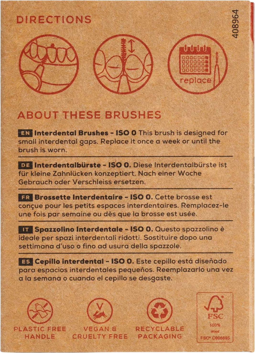 Periuțele interdentare au fost concepute pentru a curăța spațiile mici până la cele mai mari, pentru a îndepărta placa dentară și depunerile pe care ața dentară nu le poate atinge. Mânerul este realizat din lemn de fag durabil, care poate fi compostat odată ce capul periuței este îndepărtat. Perii de nylon sunt fără BPA și curăță eficient fără a răni gingiile.