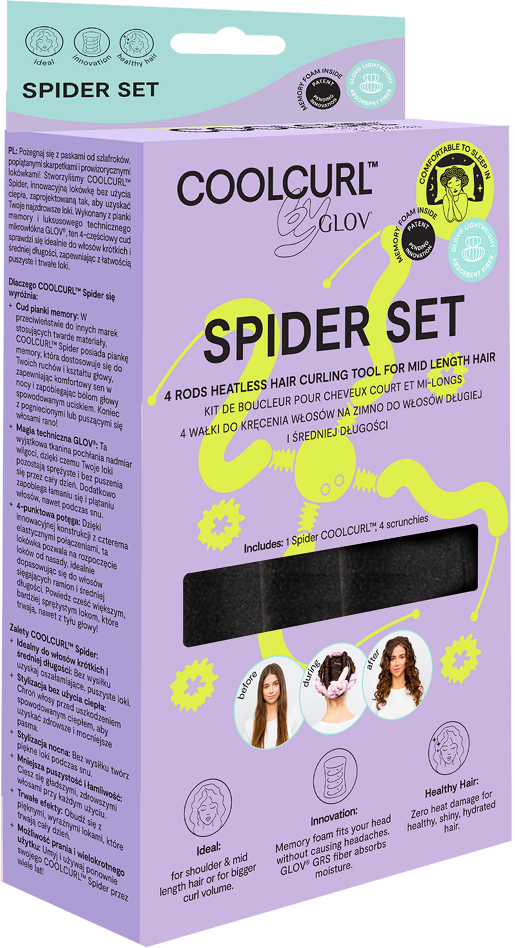 Designul optimizat al COOLCURL™ Spider îți permite să obții bucle fără a folosi căldura. Este conceput special pentru părul mai scurt și mai subțire. Nucleul său din spumă cu memorie este delicat cu părul și foarte confortabil pentru dormit - se adaptează ușor formei capului tău și mișcărilor în timpul somnului, păstrând părul fixat la locul lui. Microfibra confortabilă care învelește nucleul din spumă cu memorie este foarte blândă cu părul și reduce efectul de frizz, precum și riscul de rupere nedorită a părului.