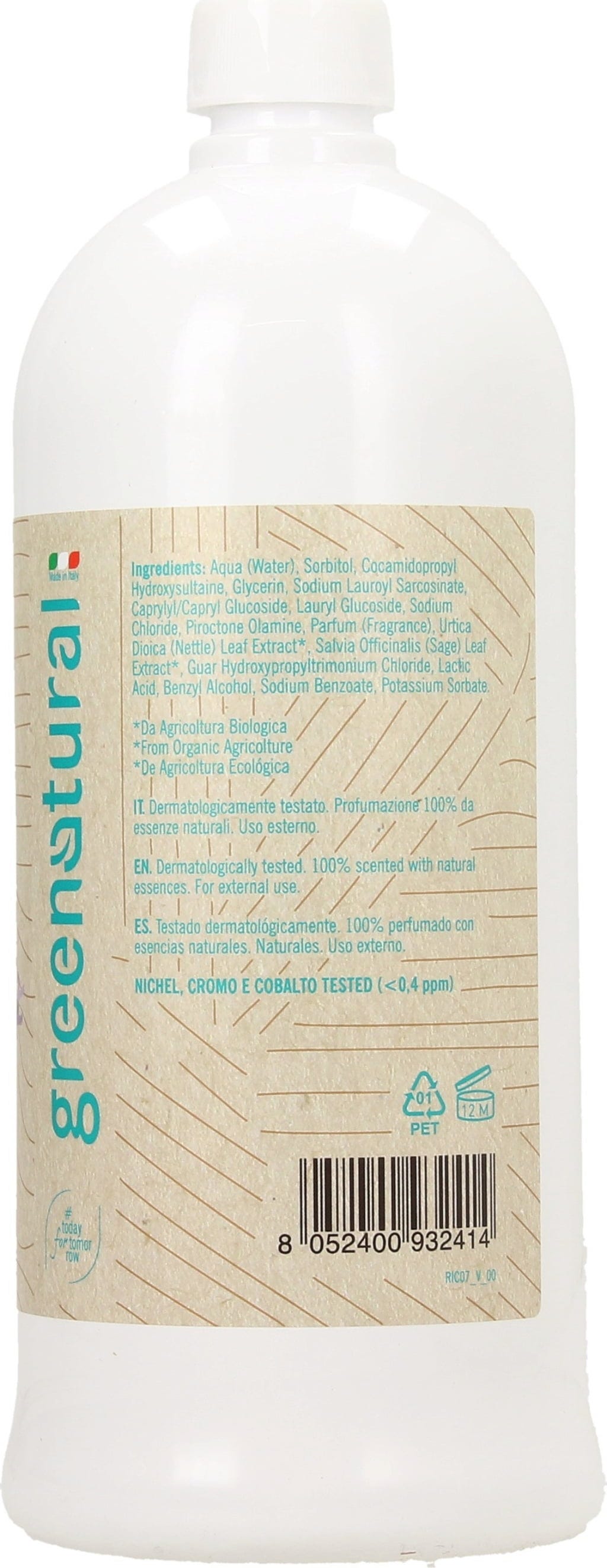 Aqua, Sorbit, Cocamidopropyl Hydroxysultaine, Glycerin, Sodium Lauroyl Sarcosinate, Caprylyl/Capryl Glucoside, Lauryl Glucoside, Sodium Chloride, Piroctone Olamine, Parfum[1], Urtica Diocia (Nettle) Leaf Extract[2], Salvia Officinalis (Sage) Leaf Extract[2], Guar Hydroxypropyltrimonium Chloride, Lactic Acid, Benzyl Alcohol, Sodium Benzoate, Potassium Sorbate
