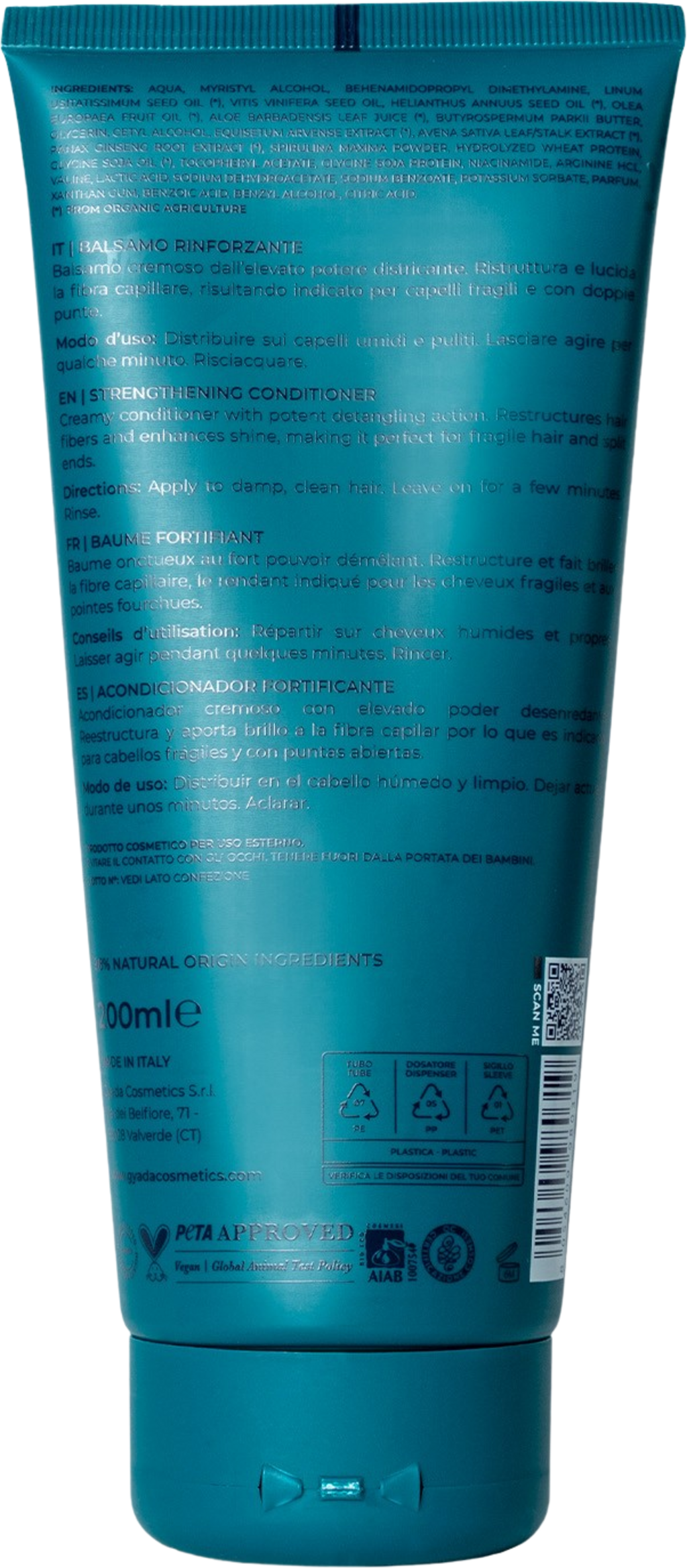 Balsamul fortifiant de la GYADA Cosmetics restructurează părul fragil și cu vârfuri despicate, oferindu-i o nouă strălucire. De asemenea, are un efect de înmuiere care ajută la descurcarea celui mai rebel păr. Produsul conține spirulină (alge marine bogate în săruri minerale, vitamine și aminoacizi), care acționează sinergic cu ginseng, ovăz și coada-calului. Componentele active conținute, precum Aloe Vera, proteine de grâu și uleiuri vegetale, contribuie la formarea unui film natural de protecție pe păr, îl hidratează și îl hrănesc în profunzime.