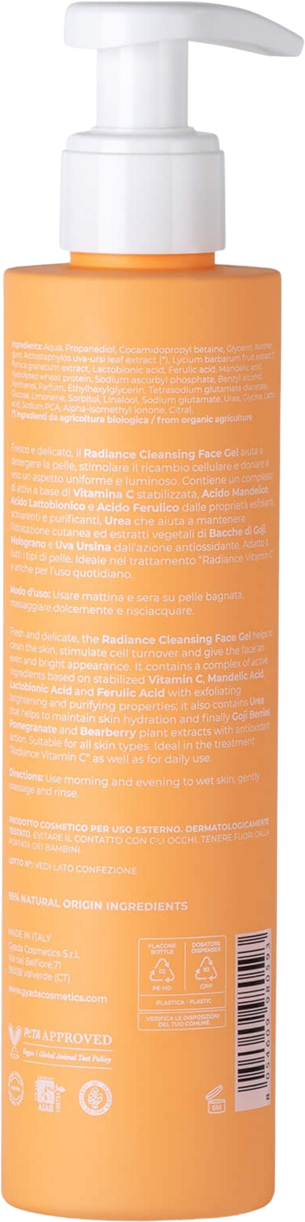 Gelul de spălare Radiance se prezintă proaspăt și delicat, ajutând la curățarea feței, stimularea regenerării și obținerea unui aspect uniform și strălucitor al pielii. Conține un complex activ pe bază de Vitamina C stabilizată, acid mandelic, acid lactobionic și acid ferulic, având proprietăți exfoliante, iluminatoare și purificatoare.