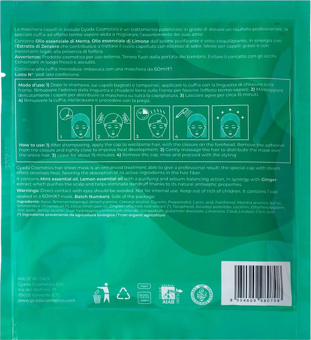 Efectul termic al acestei măști speciale asigură o mai bună absorbție a ingredientelor active și o îngrijire profesională. Formula sa a fost dezvoltată special pentru părul gras și mătreață, având un efect clarifiant datorită uleiurilor esențiale de mentă și lămâie. Proprietățile seboreglatoare, amplificate de extractele de ghimbir, curăță scalpul și împiedică în mod natural formarea mătreții.