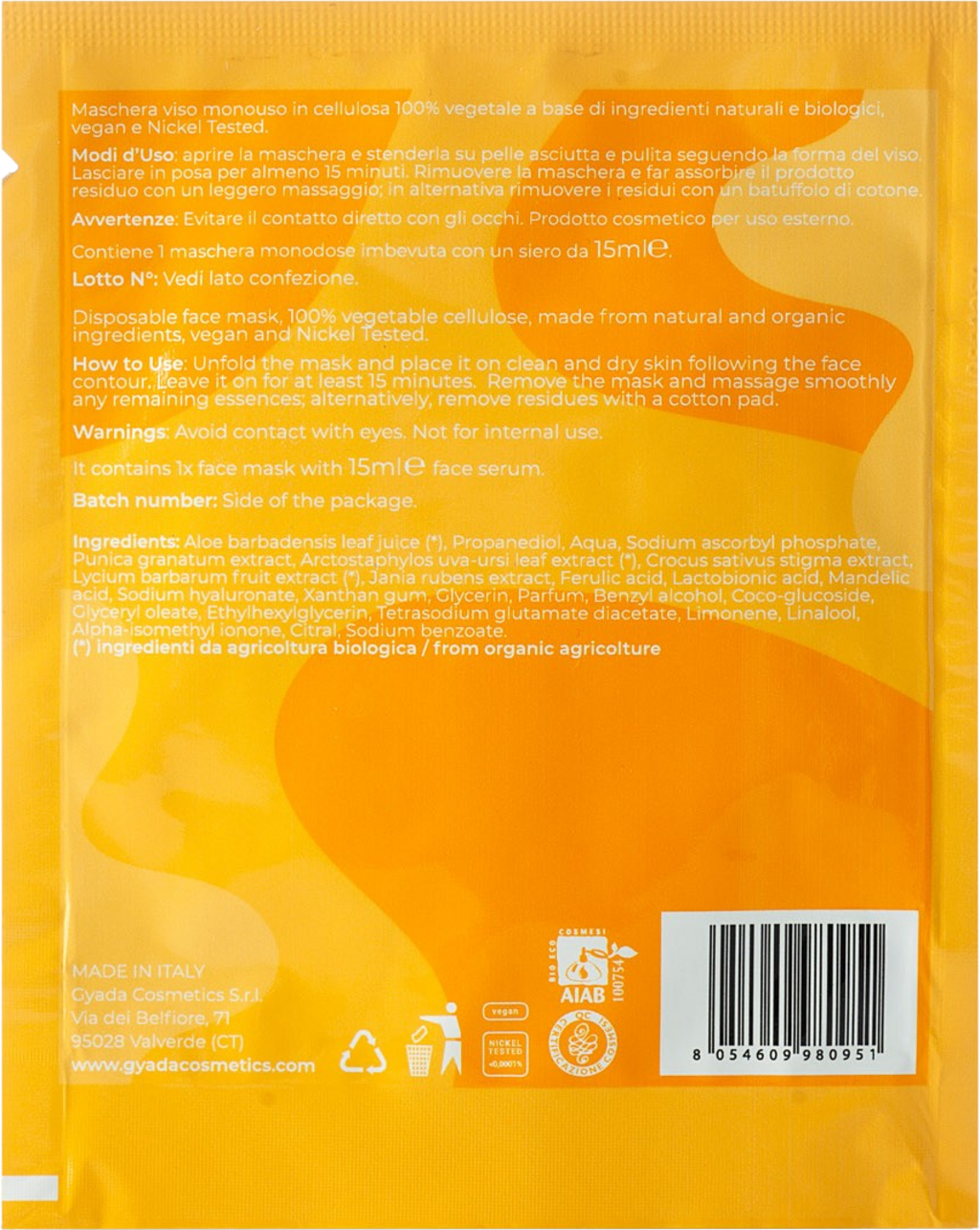 Această mască vegană de unică folosință cu vitamina C, acid mandelic, acid lactobionic și acid ferulic ajută la echilibrarea nuanței pielii. De asemenea, este îmbogățită cu extracte prețioase de plante din rodie, goji și struguri, care stimulează reînnoirea celulară, reduc imperfecțiunile și conferă un aspect radiant și sănătos pielii.