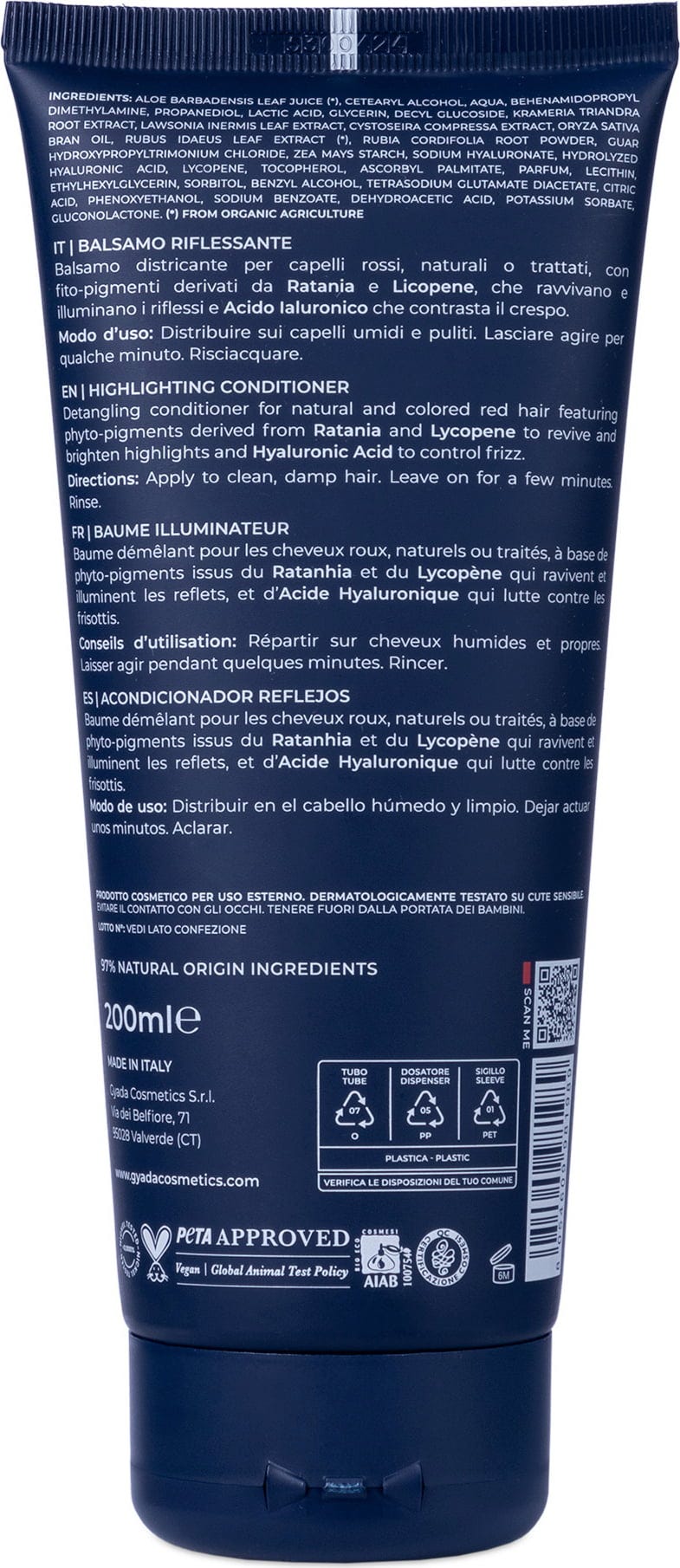 Aloe Barbadensis Leaf Juice[1], Cetearylalcohol, Aqua, Behenamidopropyl Dimethylamine, Propandiol, Lactic Acid, Glycerin, Decyl Glucoside, Krameria Triandra Root Extract, Lawsonia Inermis Leaf Extract, Cystoseira Compressa Extract, Oryza Sativa (Rice) Bran Oil, Rubus Idaeus (Himbeere) Leaf Extract[1], Rubia Cordifolia Root Powder, Guar Hydroxypropyltrimonium Chloride, Zea Mays Starch, Sodium Hyaluronate, Hydrolyzed Hyaluronic Acid, Lycopene, Tocopherol (Vitamin E), Ascorbyl Palmitate, Parfum, Lecithin, Ethylhexylglycerin, Sorbit, Benzyl Alcohol, Tetrasodium Glutamate Diacetate, Citric Acid, Phenoxyethanol, Sodium Benzoate, Dehydroacetic Acid, Potassium Sorbate, Gluconolactone