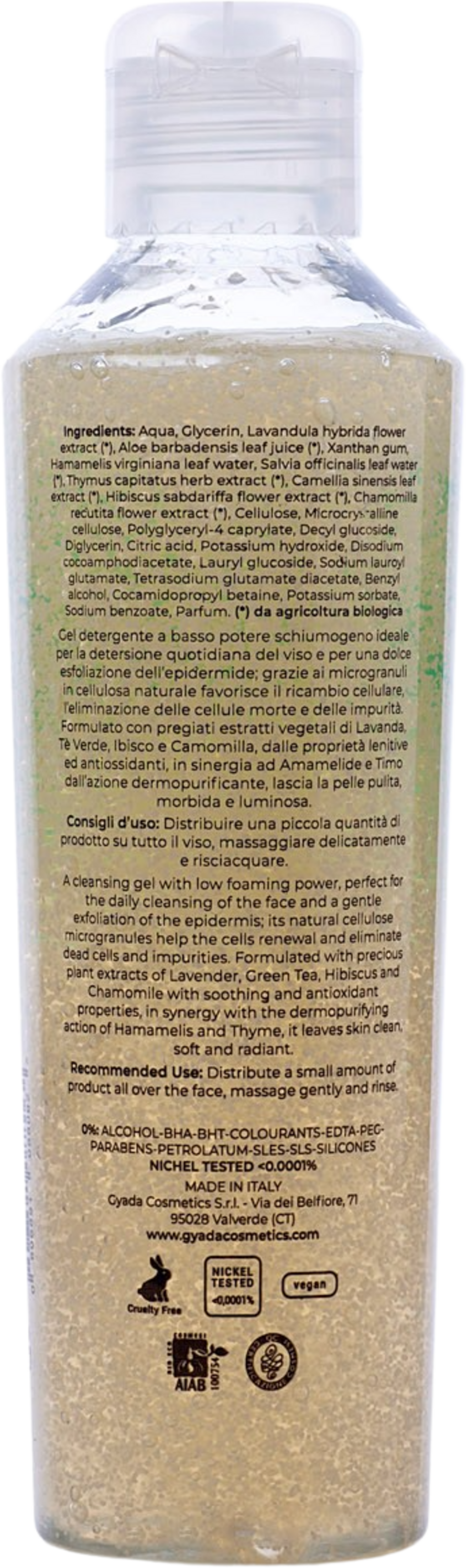 Acest gel de curățare special este ideal pentru curățarea zilnică și oferă în același timp o exfoliere delicată a pielii, datorită microgranulelor de celuloză vegetală incluse în compoziție. Acestea stimulează reînnoirea celulară, eliminând celulele moarte ale pielii și impuritățile. Formula face puțină spumă și conține extracte valoroase din plante precum ceai verde, lavandă, mușețel și hibiscus, cu proprietăți hrănitoare și antioxidante. Împreună cu cimbrul și hamamelisul, asigură un efect clarificator asupra pielii. Este un produs foarte proaspăt, care lasă pielea curată, moale și strălucitoare.