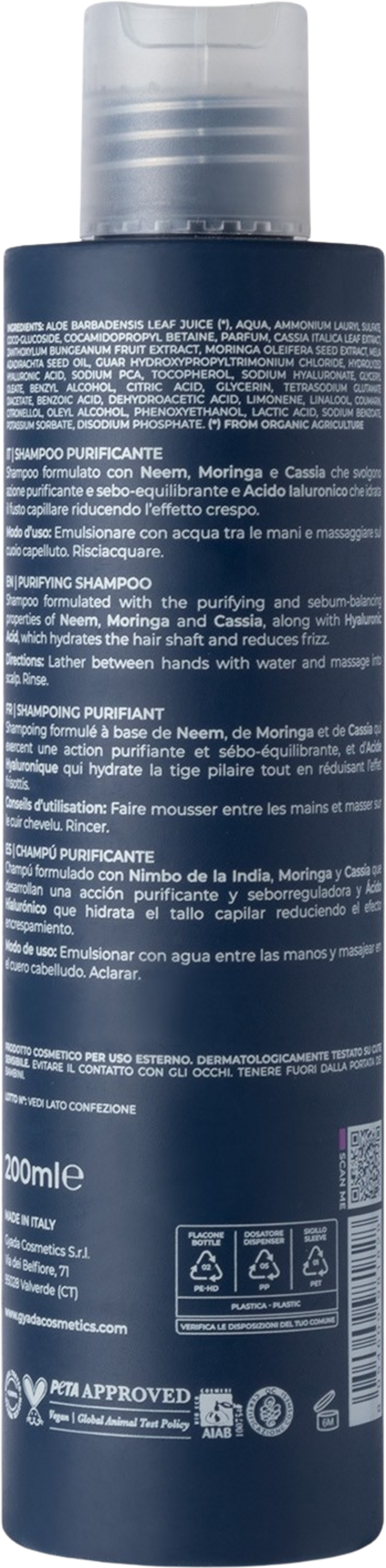 Șamponul clarifiant din linia Hyalurvedic de la GYADA este formulat cu Neem, Moringa și Cassia, fiind ideal pentru părul gras, fin și deteriorat. Neemul este cunoscut pentru proprietățile sale clarifiante și seboreglatoare, în timp ce Moringa susține sănătatea scalpului. În plus, formula conține extract emolient din piper chinezesc și Cassia întăritoare. Acest amestec de plante ayurvedice este completat de un complex de acid hialuronic, care hidratează profund și protejează părul.