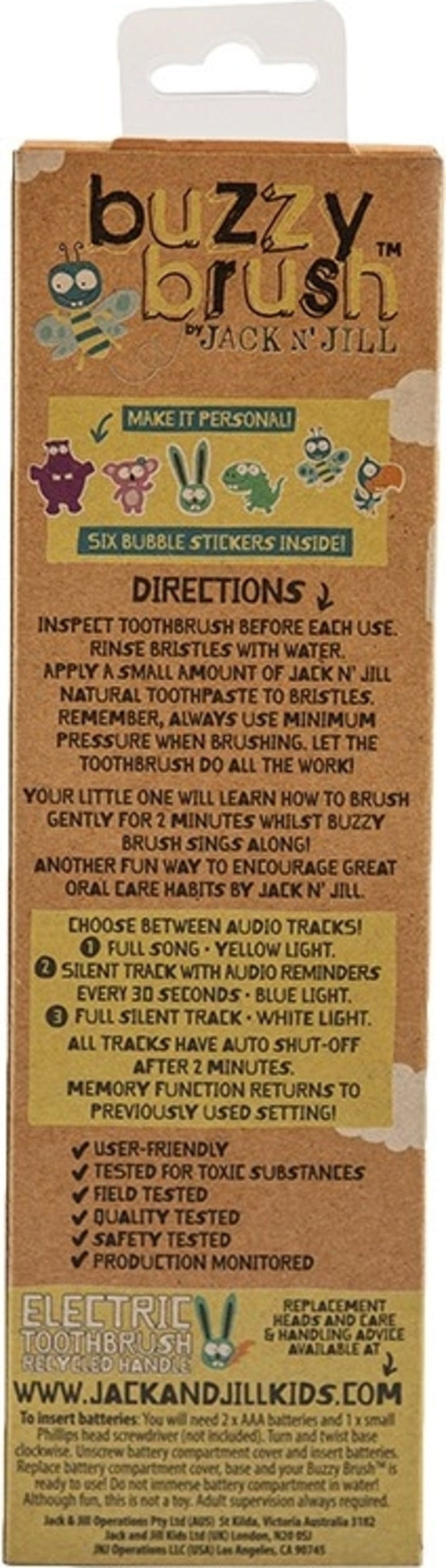 Periuța de dinți electrică Buzzy Brush oferă un design nou, îmbunătățit, cu o suprafață mată. Mânerul este realizat din plastic reciclat și are un buton din silicon moale în formă de Buzzy, pentru a activa sau opri periuța. Capetele de periaj sunt interschimbabile și oferă o curățare delicată prin perii foarte moi. Cu autocolantele incluse, periuța poate fi decorată după preferințe.