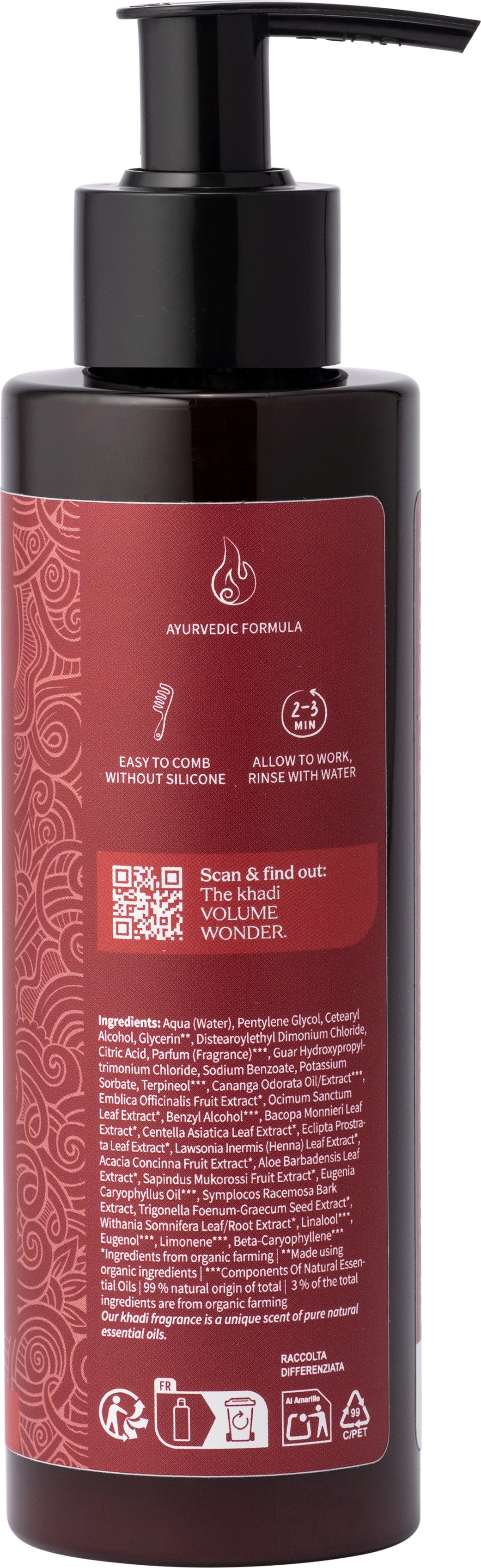 Aqua, Pentylene Glycol, Cetearylalcohol, Glycerin[1], Distearoylethyl Dimonium Chlorid, Citric Acid, Parfum[2], Guar Hydroxypropyltrimonium Chloride, Sodium Benzoate, Potassium Sorbate, Terpineol[2], Cananga Odorata (Ylang Ylang) Oil[2], Emblica Officinalis Fruit Extract[3], Ocimum Sanctum Leaf Extract[3], Benzyl Alcohol[2], Bacopa Monnieri Leaf Extract[3], Centella Asiatica Leaf Extract[3], Eclipta Prostrata Leaf Extract (Bhringraj)[3], Lawsonia Inermis Leaf Extract[3], Acacia Concinna Fruit Extract[3], Aloe Barbadensis (Aloe Vera) Leaf Extract[3], Sapindus Mukurossi Fruit Extract[3], Eugenia Caryophyllus Oil[2], Symplocos Racemosa Bark Extract, Trigonella Foenum Graecum Seed Extract[3], Withania Somnifera Leaf/Root Extract[3], Linalool[2], Eugenol[2], Limonene[2], Beta-Caryophyllene[2]