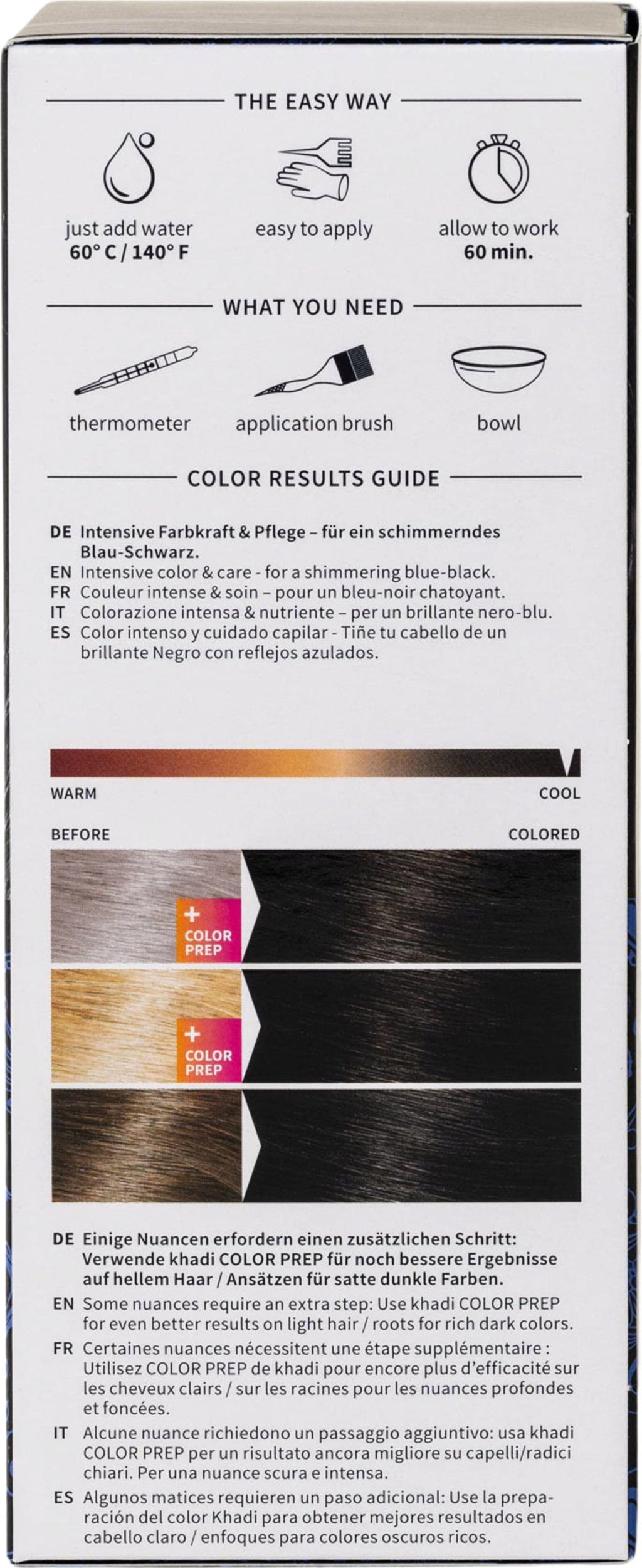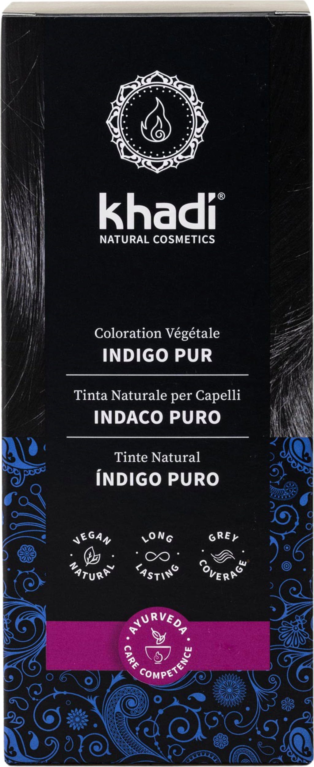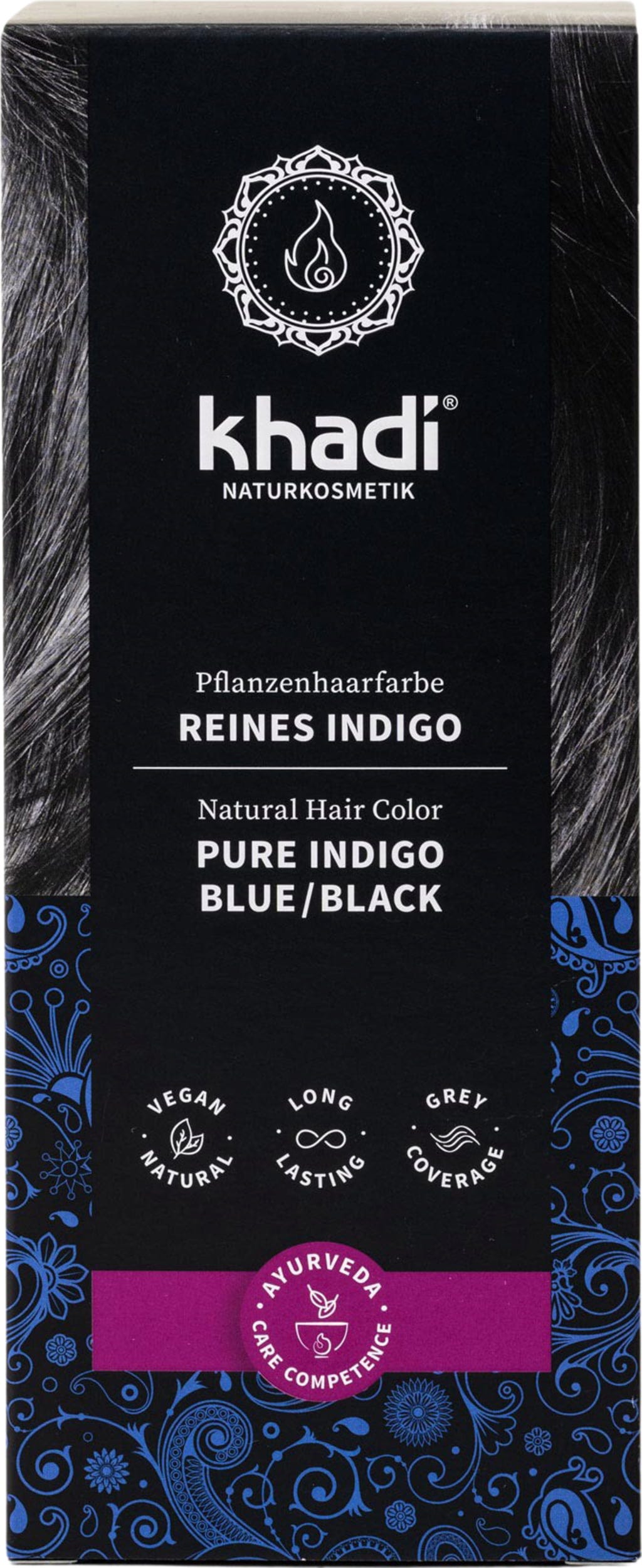 Pudra de indigo Khadi colorează părul în negru. Nuanța finală este influențată de culoarea naturală a părului. În combinație cu pudra de henna Khadi se pot obține nuanțe de la roșcat închis până la negru. Oferă volum și strălucire părului.