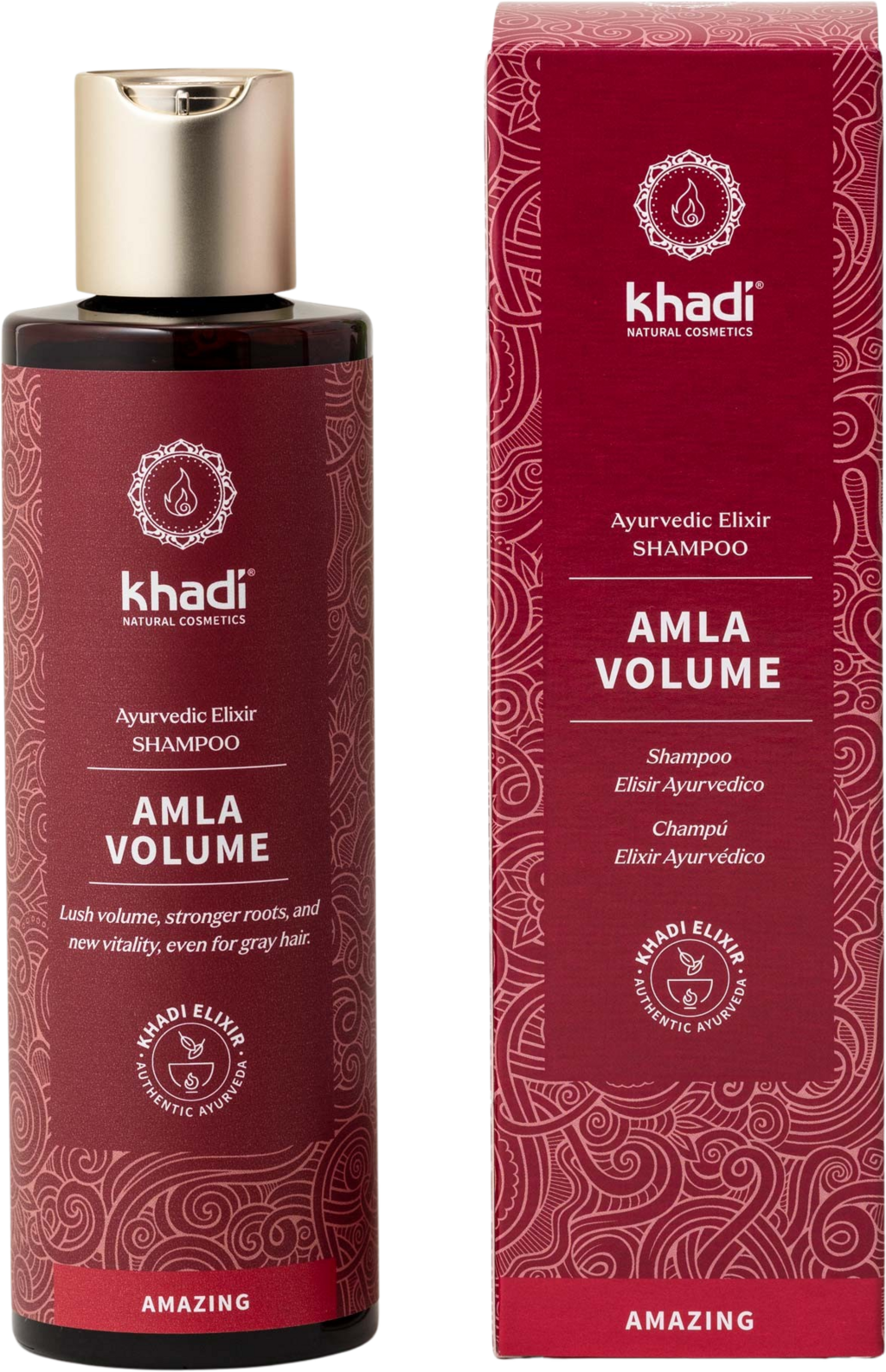 Șamponul Amla Volume curăță părul și scalpul deosebit de delicat și oferă proprietăți de fortificare. Datorită elixirului khadi conținut, acesta este deosebit de hrănitor și poate fi utilizat și pentru părul grizonat. Conține, de asemenea, o combinație de Amla bogată în vitamina C, Tulsi antioxidant și Bhringaraj, oferind părului atât rezistență, cât și volum.