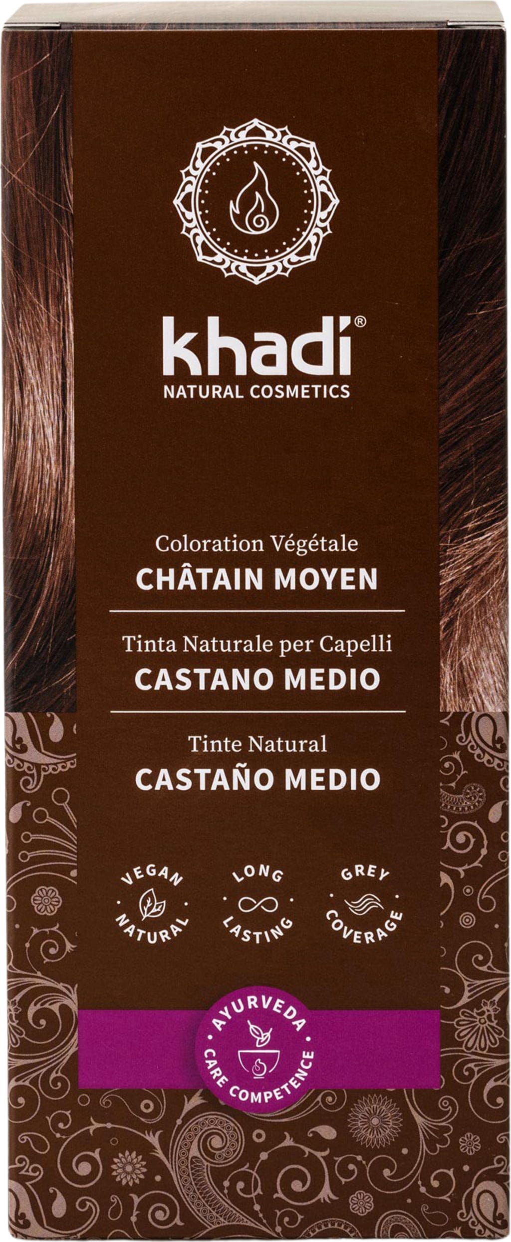 Vopseaua khadi Șaten Mediu îți colorează părul într-un șaten mediu natural, cu nuanțe de scorțișoară. Rezultatul individual al culorii depinde de culoarea inițială a părului. Nuanțele variază de la un șaten scorțișoară cald și vibrant până la un șaten mediu profund. Formula 100% vegană oferă strălucire, elasticitate și un volum irezistibil părului tău.