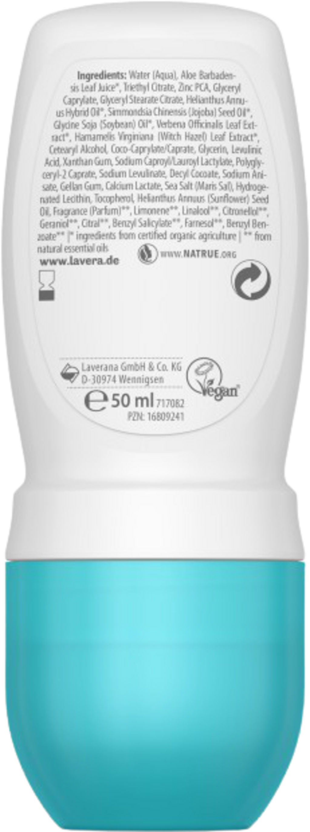 Aqua, Aloe Barbadensis Leaf Juice[1], Triethylcitrate, Zinc Pca, Glyceryl Caprylate, Glyceryl Stearat Citrat, Helianthus Annuus (Sunflower) Hybrid Oil[1], Simmondsia Chinensis (Jojoba) Seed Oil[1], Glycerin Soja Oil[1], Verbena Officinalis Leaf Extract[1], Hamamelis Virginiana Leaf Extract[1], Cetearylalcohol, Coco Caprylate/Caprate, Glycerin, Levulinic Acid, Xanthan Gum, Sodium Caproyl/Lauroyl Lactate, Polyglyceryl-2 Caprate, Sodium Levulinate, Decyl Cocoate, Sodium Anisate, Gellan Gum, Calcium Lactate, Maris Sal, Hydrogenated Lecithin, Tocopherol (Vitamin E), Helianthus Annus (Sunflower) Seed Oil, Parfum[2], Limonene[2], Linalool[2], Citronellal[2], Geraniol[2], Citral[2], Benzyl Salicylate[2], Farnesol[2], Benzylbenzoat[2]