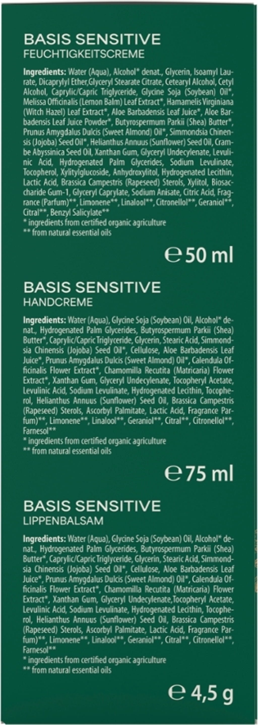 Aqua, Alcohol Denat, Glycerin, Isoamyl Laurate, Dicaprylyl Ether, Glyceryl Stearat Citrat, Cetearylalcohol, Cetyl Alcohol, Caprylic/Capric Triglyceride, Glycerin Soja Oil[1], Melissa Officinalis Leaf Extract[1], Hamamelis Virginiana Leaf Extract[1], Aloe Barbadensis Leaf Juice[1], Butyrospermum Parkii (Shea) Butter[1], Prunus Amygdalus Dulcis (Sweet Almond) Oil[1], Simmondsia Chinensis (Jojoba) Seed Oil[1], Helianthus Annus (Sunflower) Seed Oil[1], Crambe Abyssinica Seed Oil, Dehydroxanthan Gum, Glyceryl Undecylenate, Levulinic Acid, Hydrogenated Palm Glycerides, Sodium Levulinate, Tocopherol (Vitamin E), Xylitylglucoside, Anhydroxylitol, Hydrogenated Lecithin, Brassica Campestris Sterols, Xylit, Biosaccharide Gum-1, Glyceryl Caprylate, Sodium Anisate, Parfum[2], Limonene[2], Linalool[2], Citronellol[2], Geraniol[2], Citral[2], Benzyl Salicylate[2]