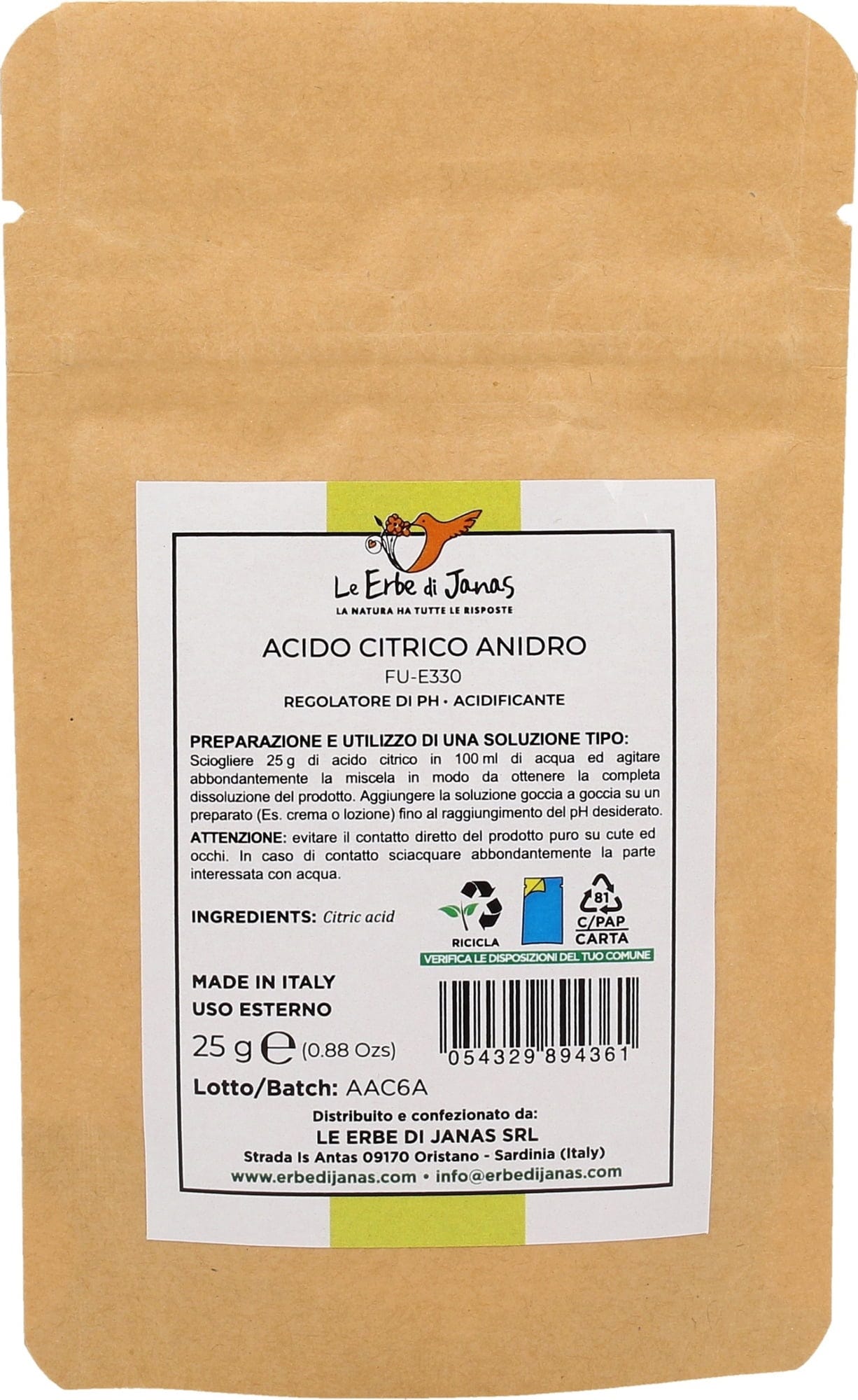 Acidul citric cristalin de la Le Erbe di Janas provine din fructe citrice. Este potrivit în mod optim ca regulator de pH pentru cosmeticele preparate acasă sau ca element efervescent pentru fabricarea bombelor de baie. De asemenea, poate fi folosit în gospodărie cu o funcție de curățare variată.