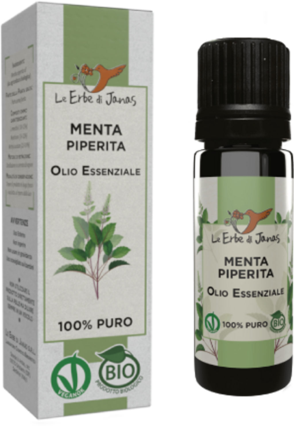 Menta este parte din familia Lamiaceae (Labiatae). Uleiul esențial de la Le Erbe di Janas este produs prin distilarea cu abur. Este vegan, 100% pur și este îmbuteliat într-o sticlă care își protejează conținutul de lumină.