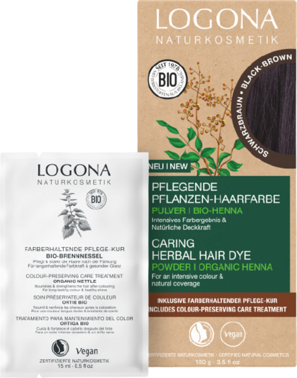 Culorile de păr vegetale Logona sunt deosebit de delicate și colorează părul mai blând decât vopselele chimice. Ele nu atacă direct structura firului de păr, ci se așează protector în jurul părului, astfel încât rezultatul culorii poate varia individual în funcție de culoarea inițială a părului. Fiecare culoare de păr vegetală este o combinație de henna, ierburi și fructe, care asigură luminozitate intensă, mai multă strălucire și volum natural. Culoarea de păr vegetală poate fi aplicată imediat și este potrivită și pentru vopsirea rădăcinilor. Tratamentul de întreținere a culorii, inclus, cu urzică ecologică desăvârșește procesul de vopsire: acesta netezește părul și sigilează pigmenții de culoare, astfel încât culoarea să reziste mai mult timp.