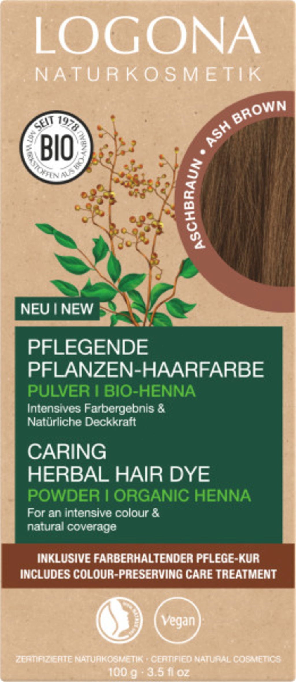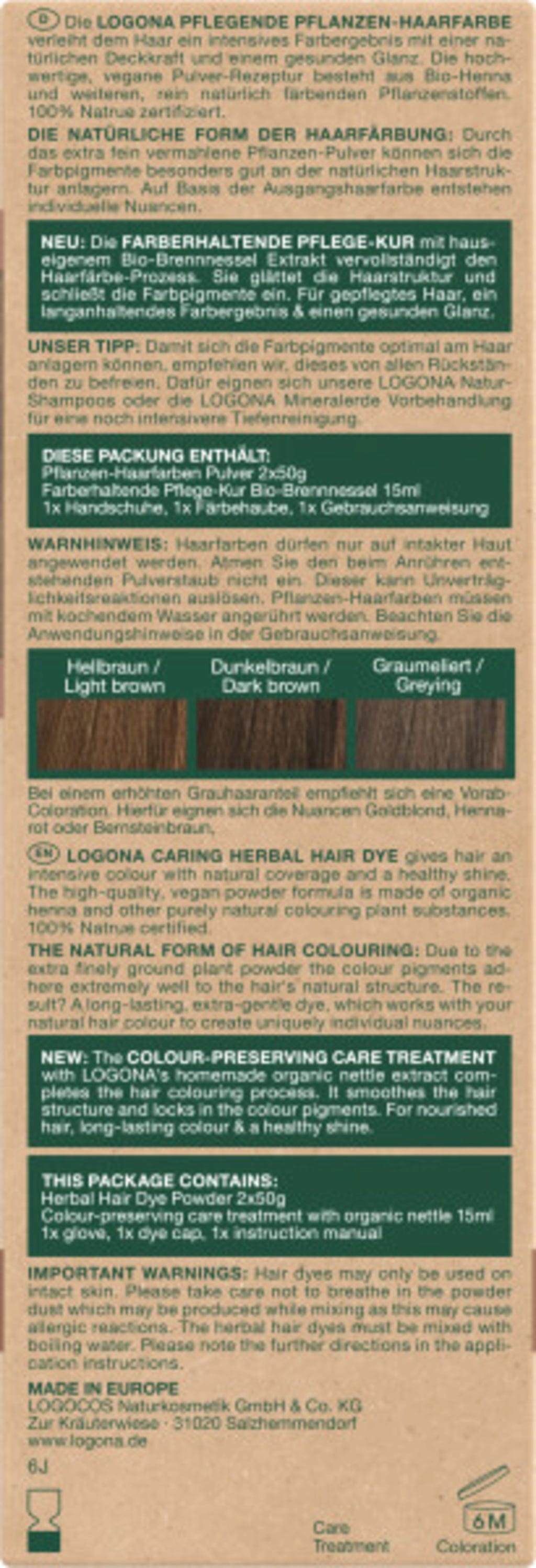 Această vopsea este perfectă pentru a colora părul de la brun șaten la brun închis într-un frumos brun natural. Toate culorile de păr vegetale Logona sunt deosebit de blânde și colorează părul mai puțin agresiv decât vopselele chimice. Acționează fără a afecta structura firului de păr, ci îl învelesc protector. Fiecare culoare de păr vegetală creează întotdeauna strălucire intensă, mai mult luciu și volum natural, datorită unei formule din henna, ierburi și fructe. Tratamentul de îngrijire inclus, cu urzica bio, completează procesul de vopsire. Acesta netezește părul și sigilează pigmenții, astfel încât culoarea să reziste mai mult timp.