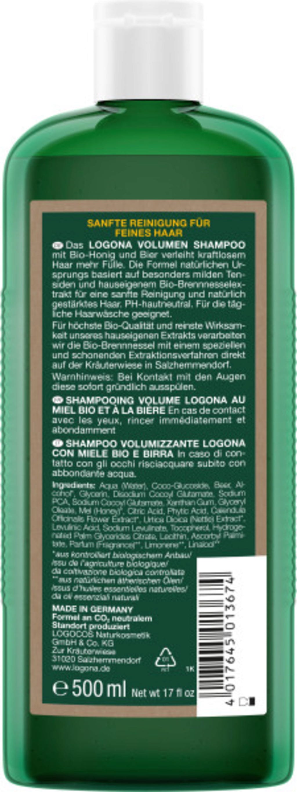 Șamponul pentru volum cu bere și miere a fost creat special pentru nevoile părului fin și sensibil. Ingredientele de curățare blânde, berea cu efect fortifiant, mierea bio și o compoziție atent selecționată de extracte vegetale oferă părului mai mult volum și elasticitate, fără a-l încărca.
