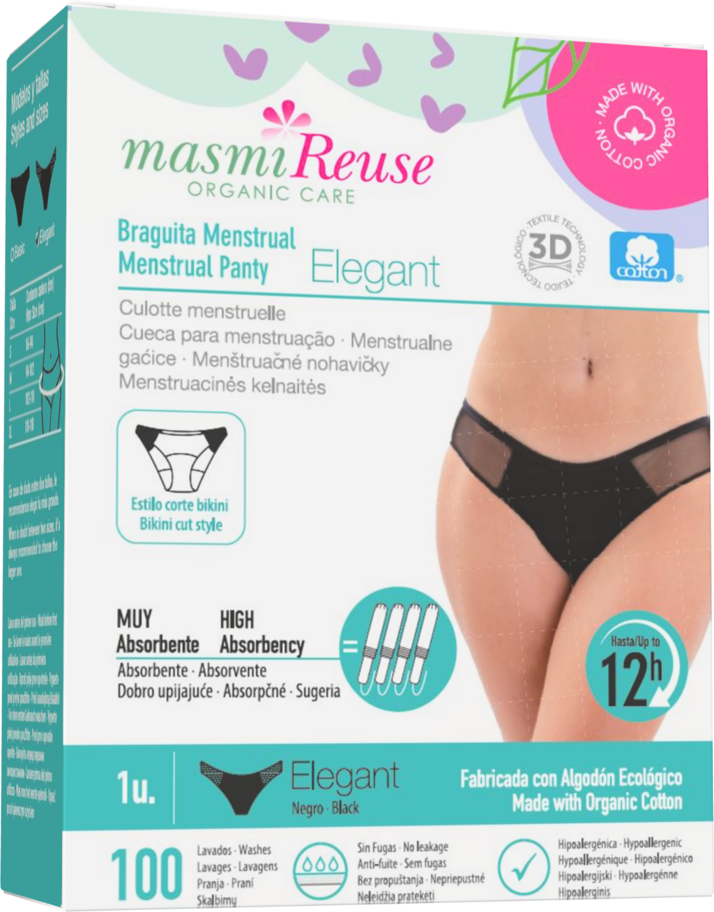 Confecționați din bumbac organic, chiloții menstruali oferă o experiență de purtare plăcută și sunt hipoalergenici. Croiala tip bikini cu inserție de mesh este deosebit de elegantă, asigurând protecție împotriva scurgerilor și absorbind echivalentul a patru tampoane. Tehnologia sa textilă 3D constă din trei straturi: un strat protector respirabil din bumbac organic și PU, un nucleu absorbant de înaltă capacitate din bumbac organic și un strat din bumbac organic moale, care intră în contact cu zona intimă.