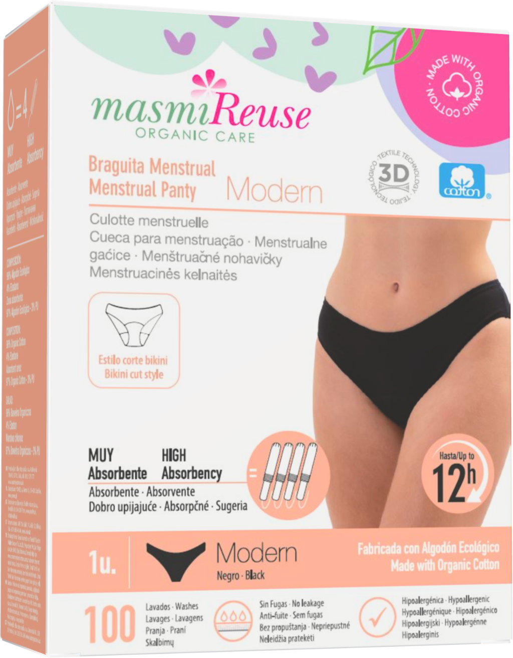 Realizat din bumbac organic și cu un design atractiv de tip bikini, chiloteii menstruali oferă o experiență plăcută de purtare și o protecție sigură împotriva scurgerilor. Pot absorbi echivalentul a patru tampoane și sunt hipoalergenici. Datorită tehnologiei textile 3D, îți oferă protecție de încredere. Aceasta constă din trei straturi: un strat de protecție respirabil din bumbac organic și PU, un nucleu absorbant foarte eficient din bumbac organic și un strat din bumbac organic moale, care intră în contact cu zona intimă.