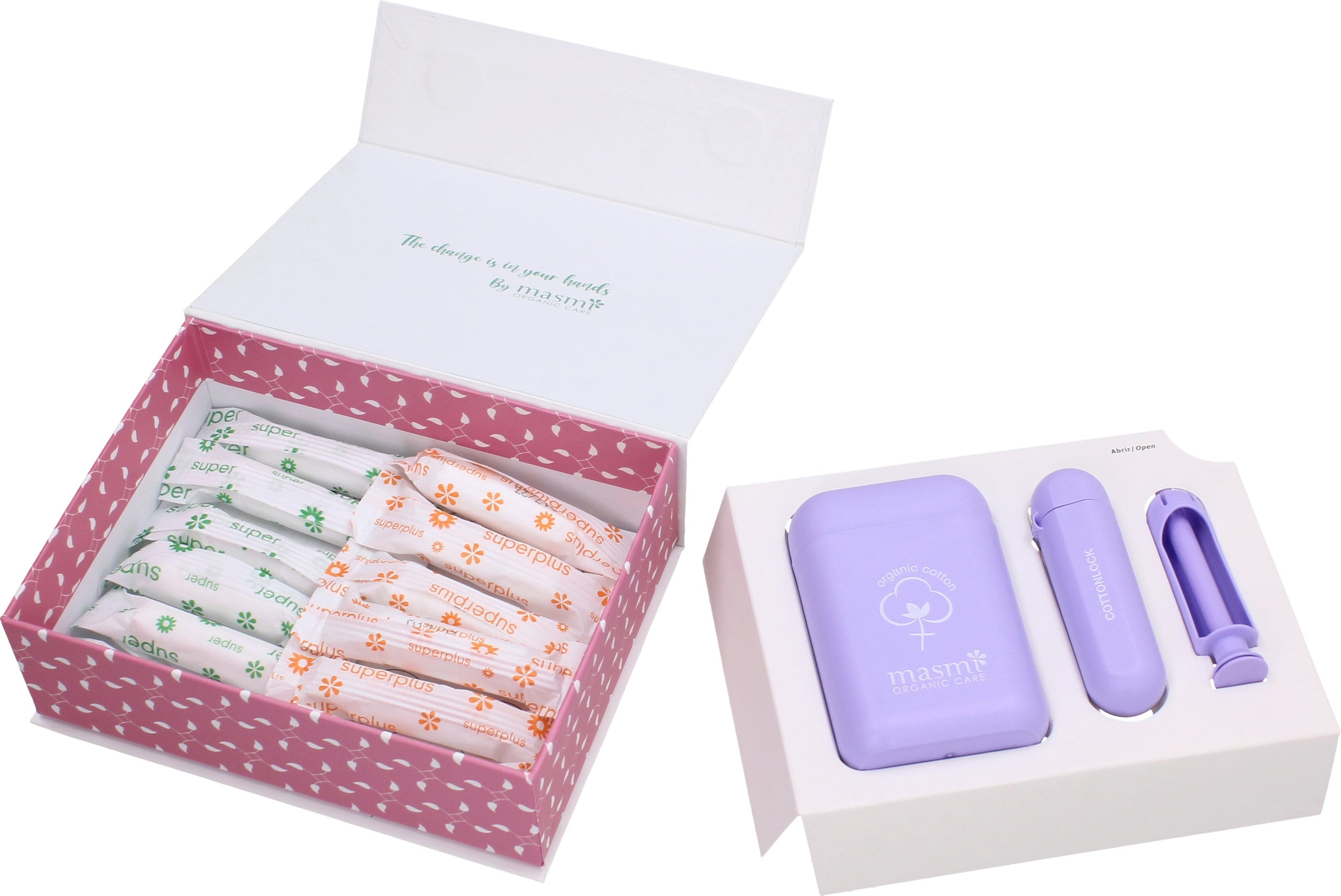 În acest set, atenția se concentrează asupra aplicătorului reutilizabil, care îți ușurează introducerea tampoanelor masmi. Este realizat dintr-un plastic medicinal durabil și hipoalergenic, care poate fi folosit timp de până la zece ani. Astfel, poate reduce o cantitate semnificativă de deșeuri produse de aplicătoarele de unică folosință. În plus, se curăță cu usurință sub jet de apă. De asemenea, cutia conține un etui de depozitare pentru tampoane și aplicător, precum și tampoane în două dimensiuni diferite.